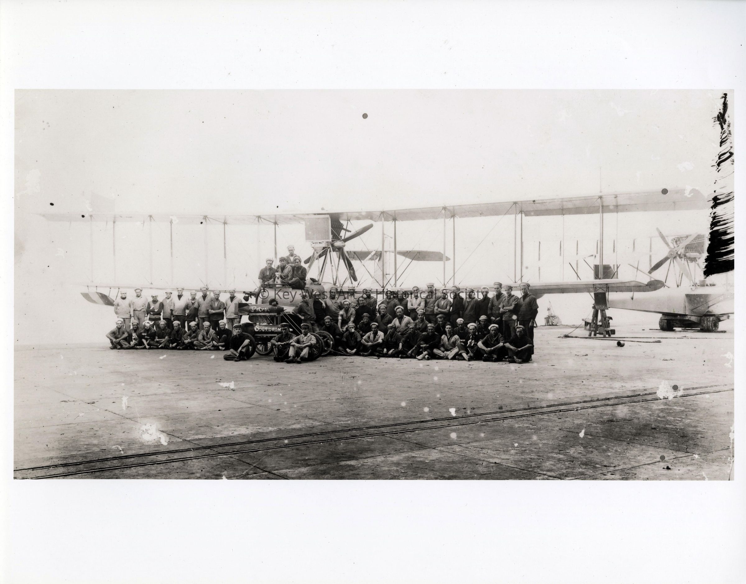 Black and white photograph of a U.S. Navy patrol squadron and their airplane during World War I.