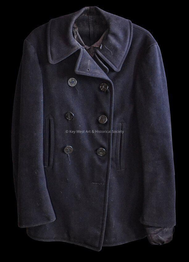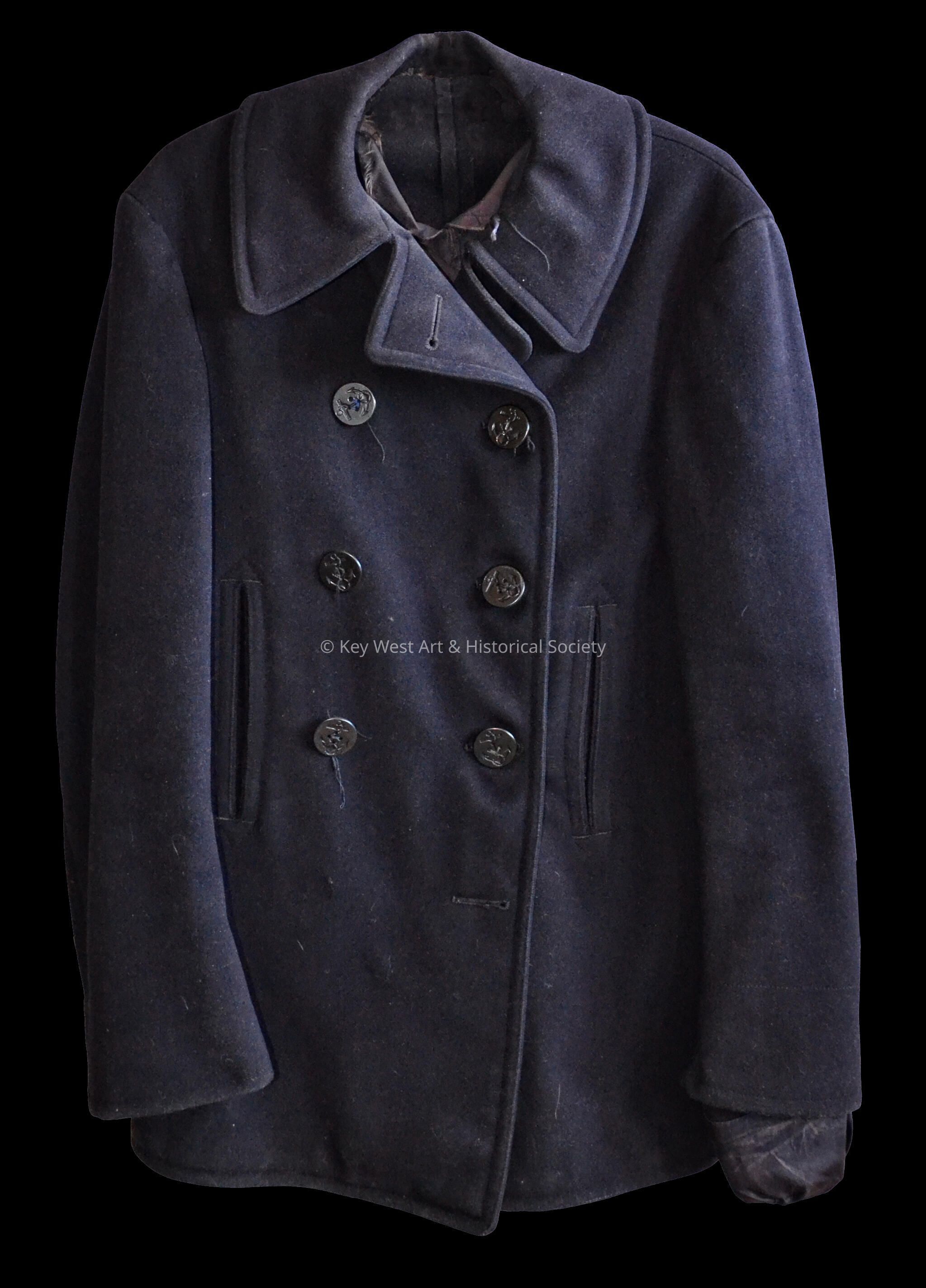 U.S. Navy World War II wool pea coat formerly belonging to William E. Davis. During the war, Davis served as a Motor Machinist's Mate, 2nd Class, and was stationed in the Caribbean on a small submarine-hunting boat.Collection
