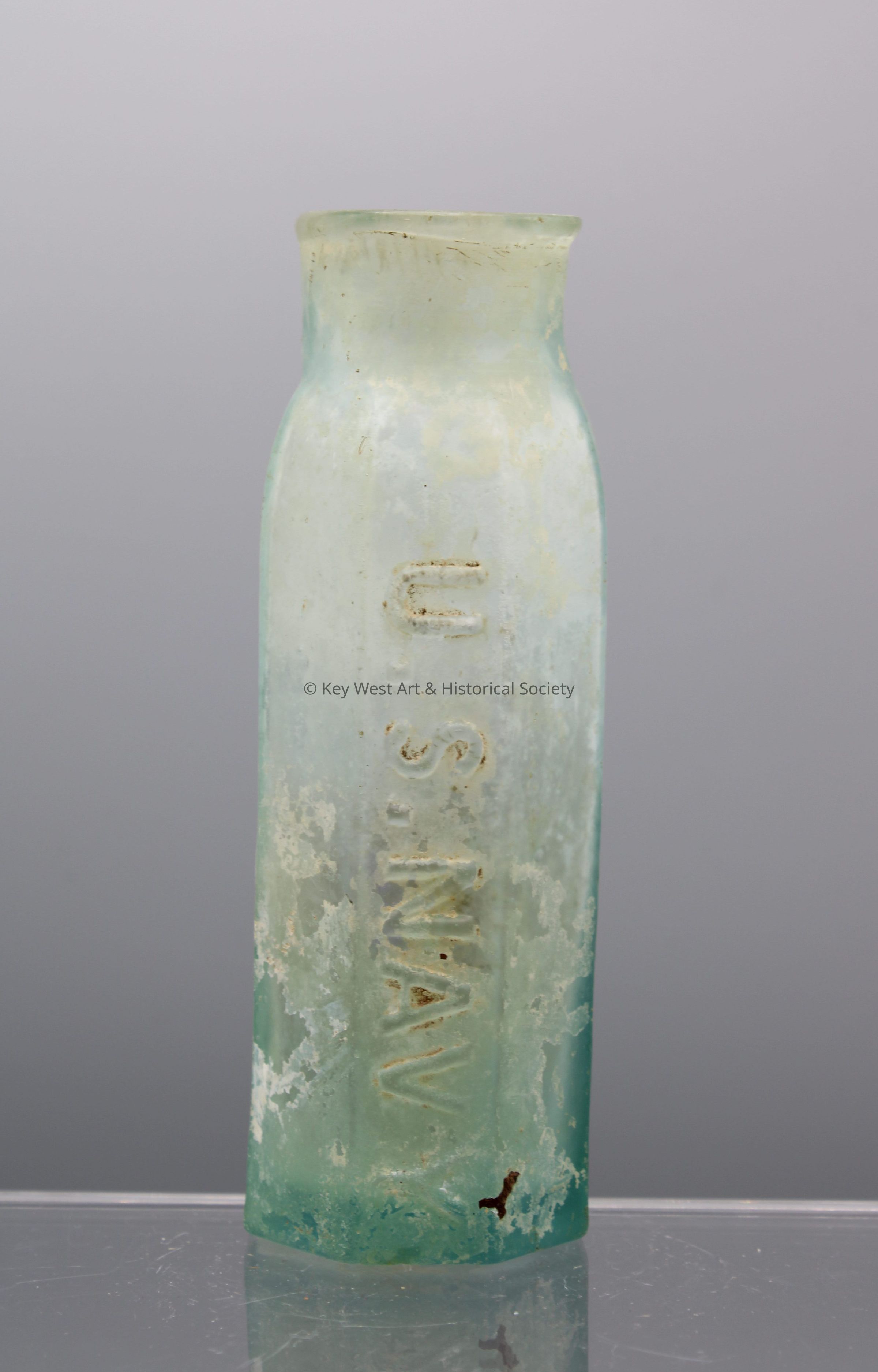 Light blue bottle with eight (8) sides and embossing that reads 'U.S. Navy / Pepper.'