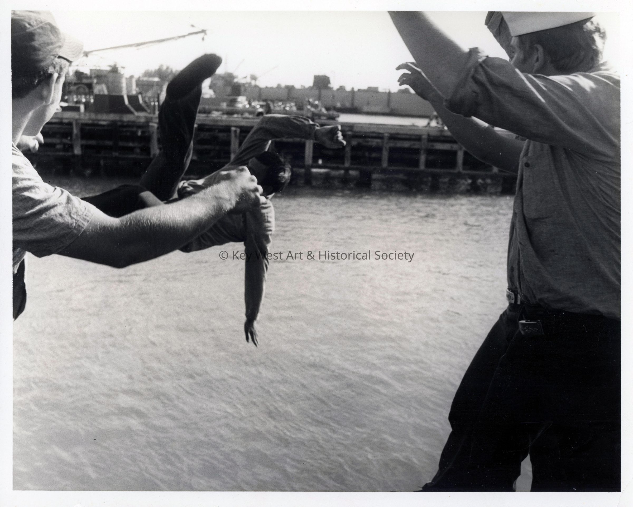 Black and white photograph of U.S. Navy sailors throwing a shipmate into the water at Naval Station Key West.