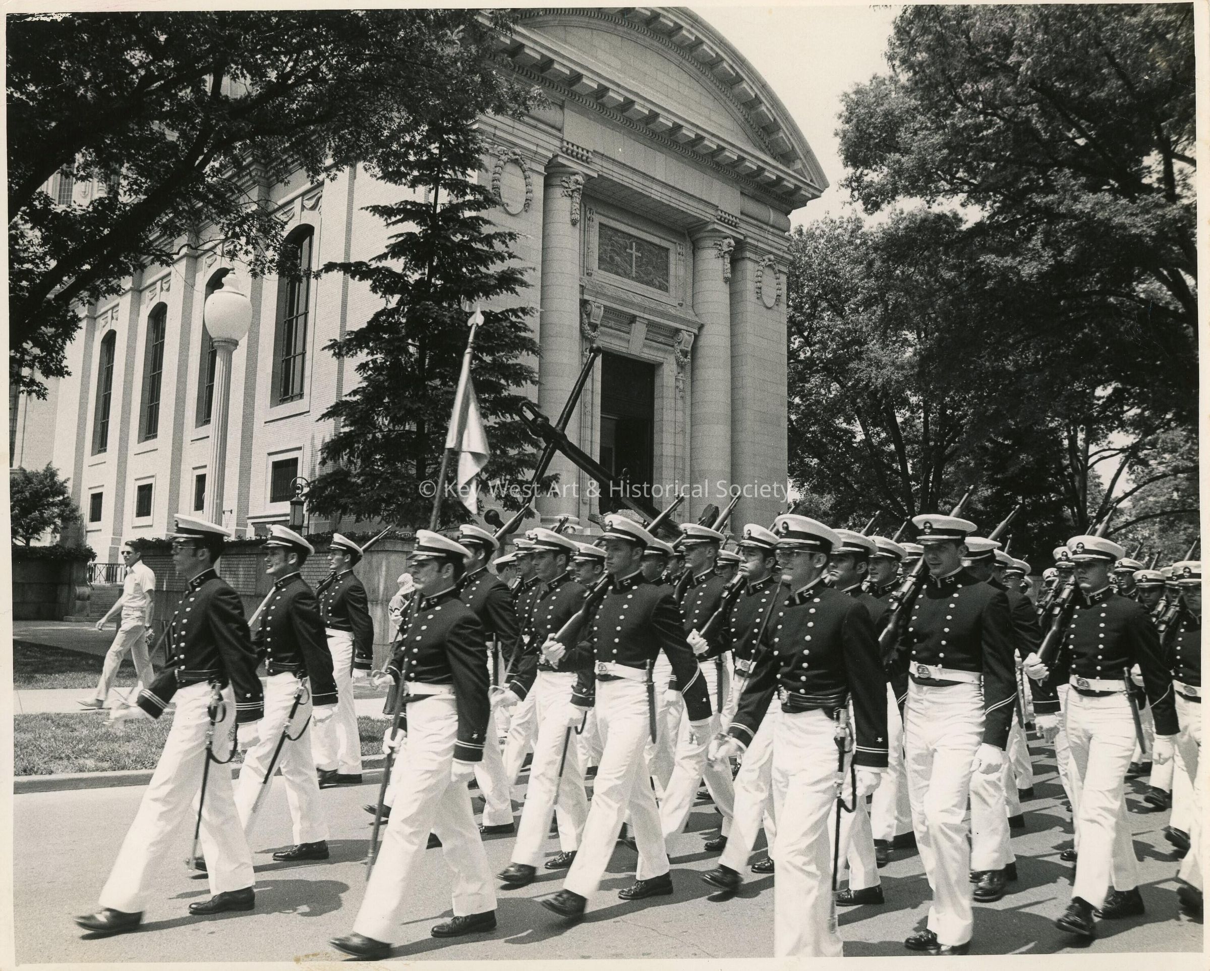Black and white photograph of U.S. Navy sailors marching in front of the U.S. Naval Academy Chapel.