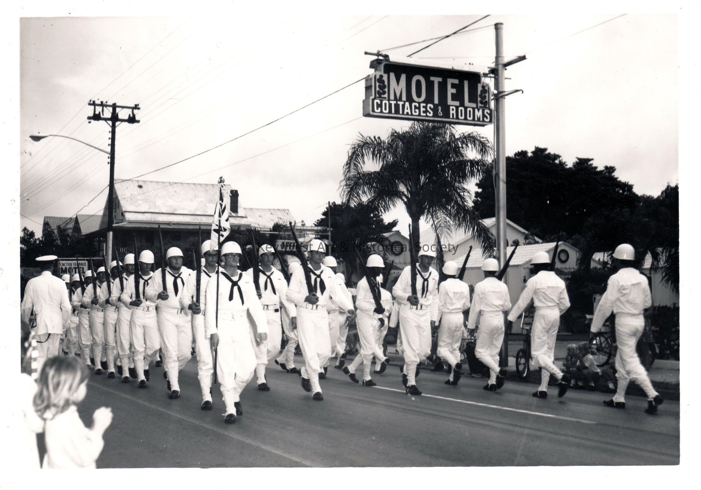 Black and white photograph of U.S. Navy sailors marching in a parade along Truman Avenue in front of the Cactus Terrace Motel.
