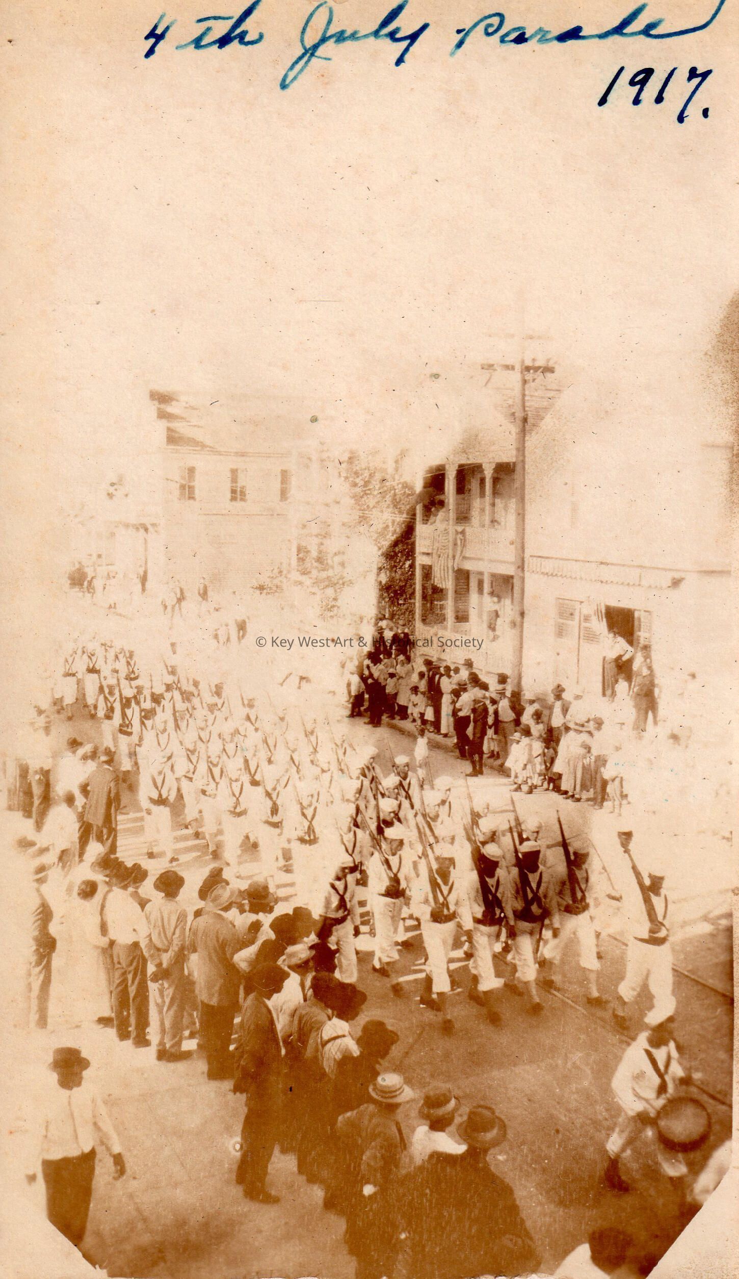Black and white photograph of U.S. Navy sailors marching in the 4th of July Parade on Duval Street in 1917.