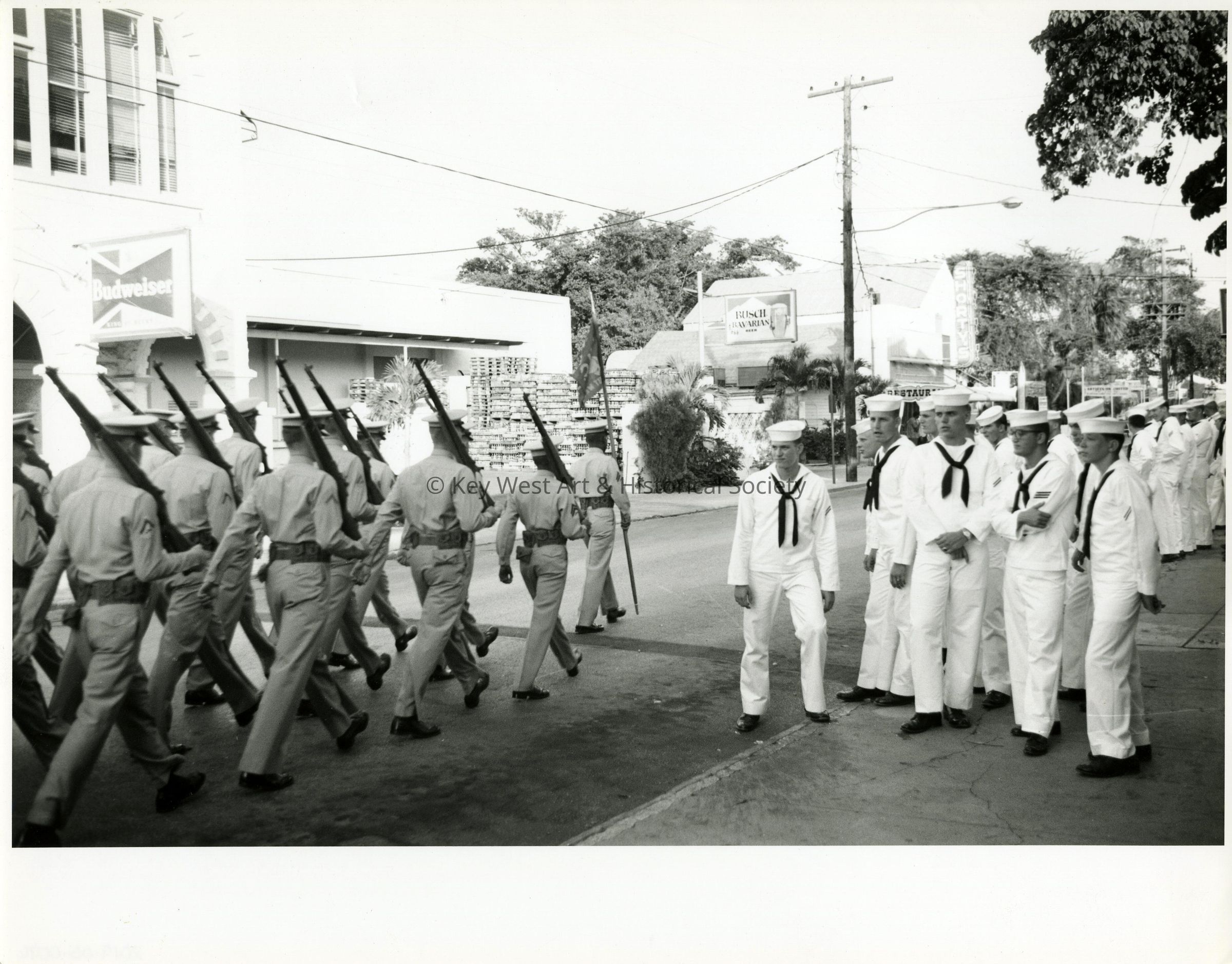 Black and white photograph of a group of U.S. Navy sailors watching a parade on the 200 block of Duval Street.