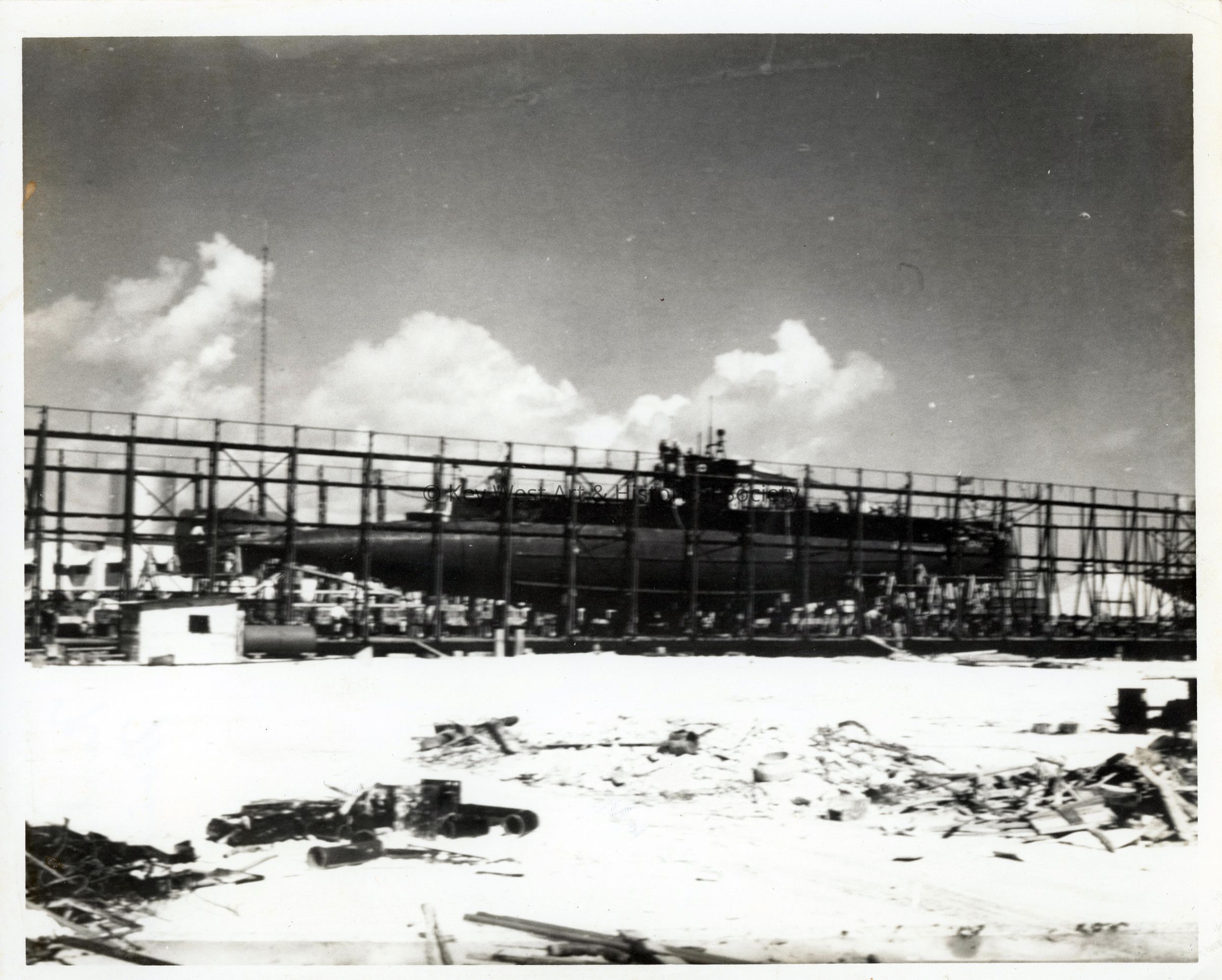 Black and white photograph of a U.S. Navy submarine on the marine railway at Naval Station Key West.