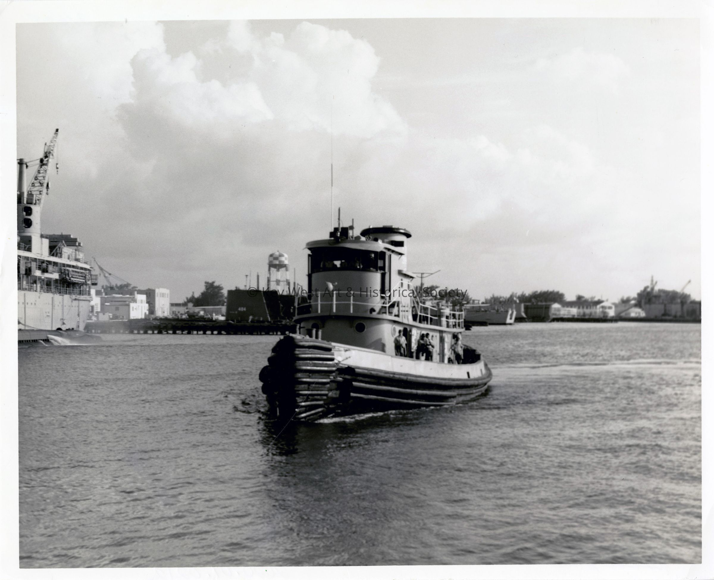 Black and white photograph of a U.S. Navy tugboat at Naval Station Key West.