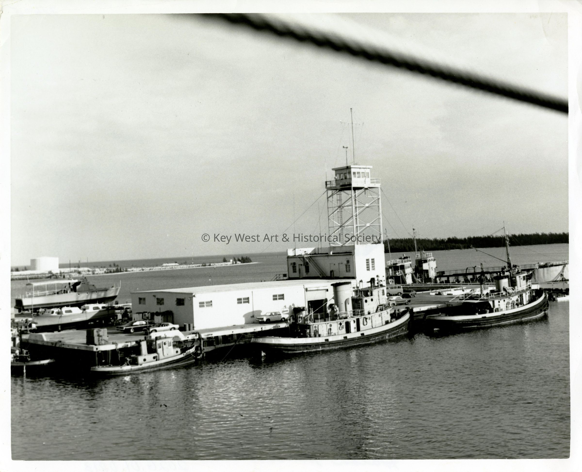 Black and white photograph of U.S. Navy tugboats, U.S.S. Waneta (YTM-384) and U.S.S. Abinago (YTM-493), docked at Naval Station Key West.
