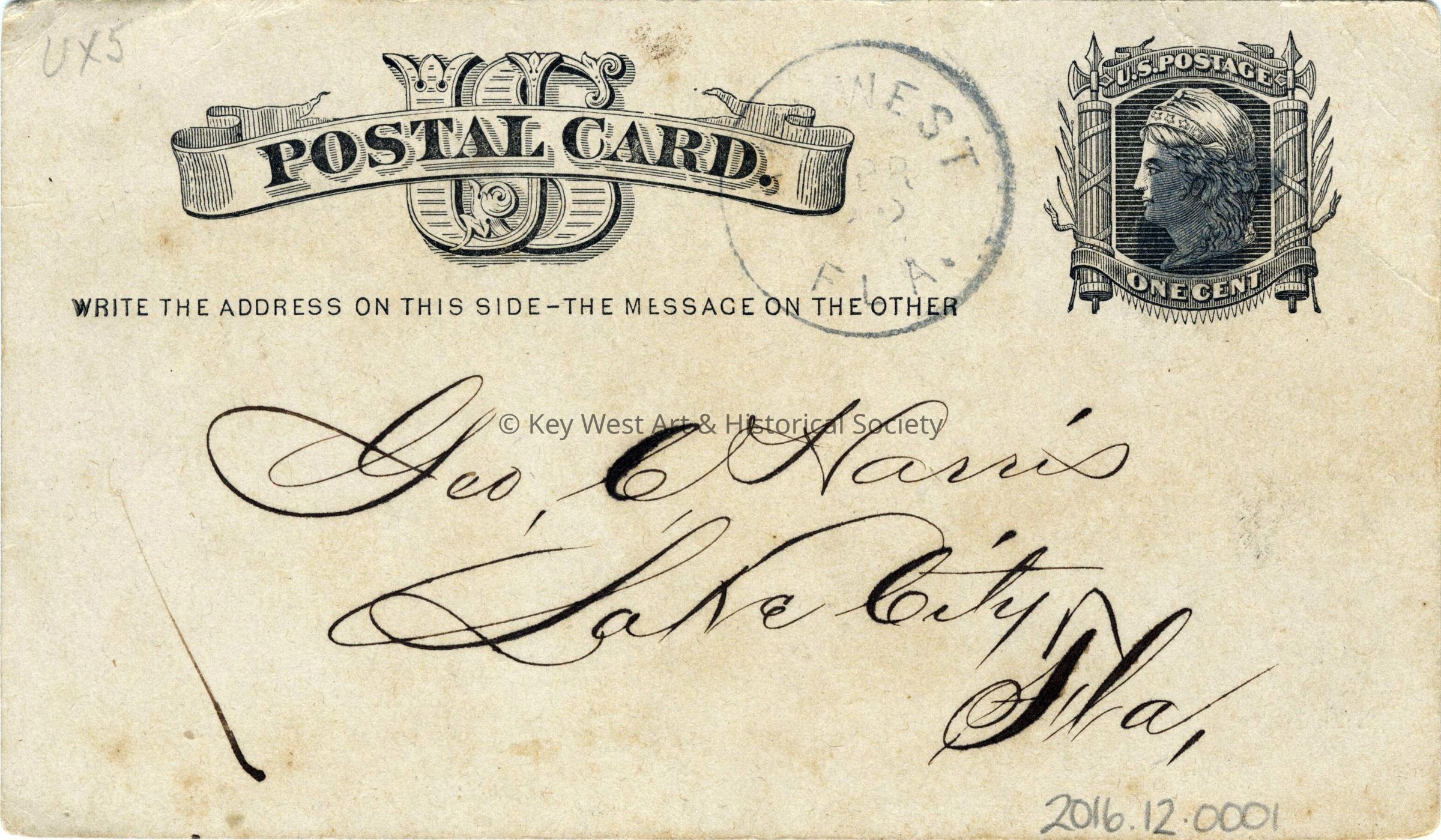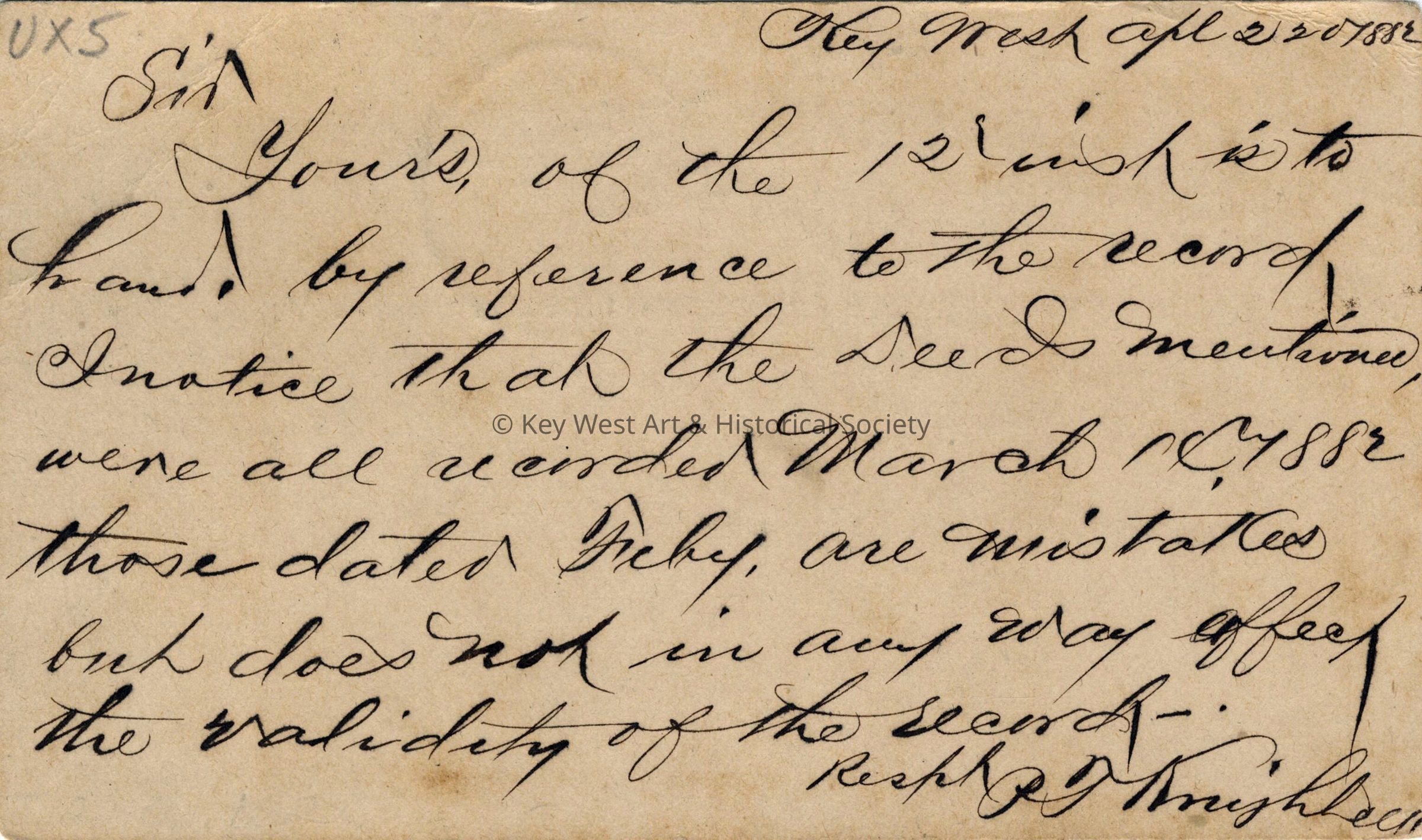 United States Postal Card postmarked from Key West, sent to George C. Harris in Lake City, Florida. Message on verso reads, 'Sir, Yours of the 12th instant is to hand, by reference to the record. I notice that the Deeds mentioned were all recorded March 14, 1882 those dated February are mistakes but does not in any way affect the validity of the record. Respectfully, P. T. Knight'.Collection