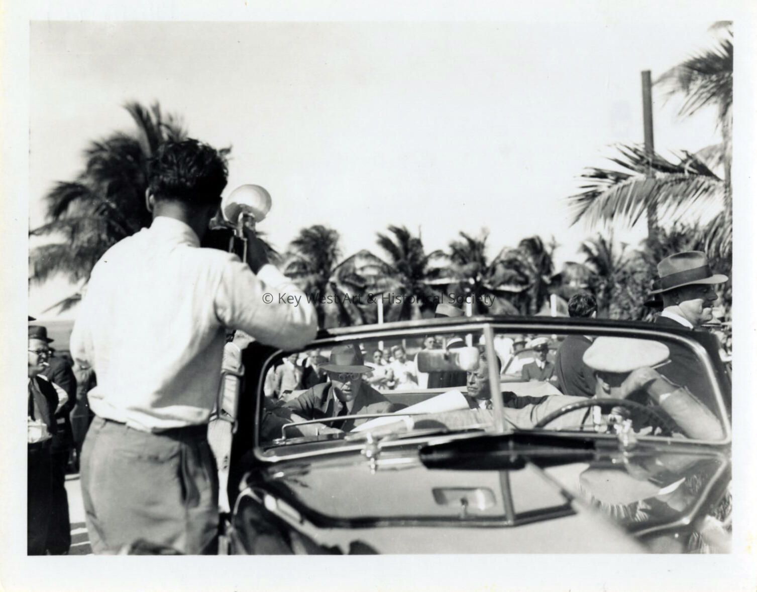 Black and white photograph of U.S. President Franklin D. Roosevelt in a motorcade touring Key West. There is a photographer in the foreground taking Roosevelt's image.