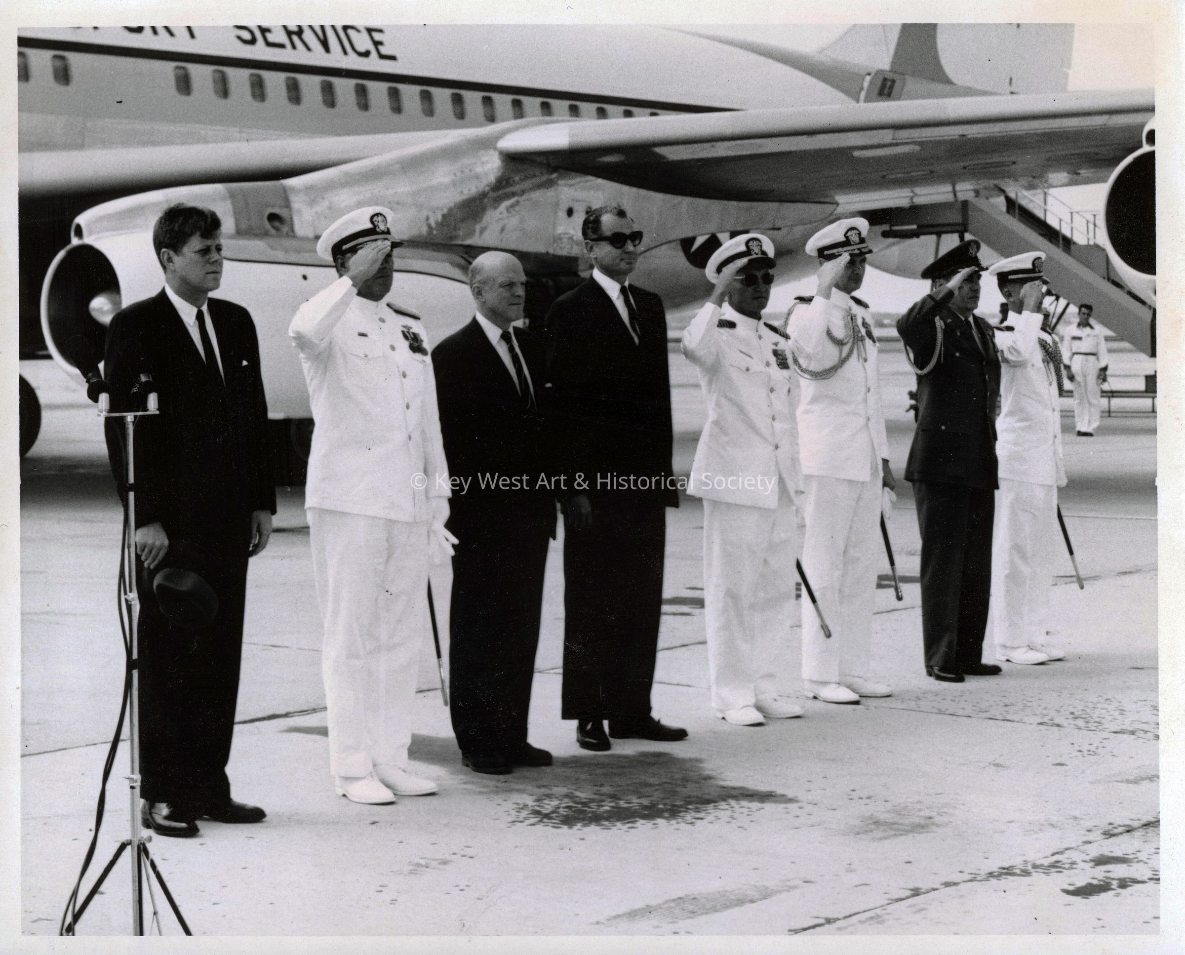Black and white photograph of U.S. President John F. Kennedy during a visit to Naval Air Station Key West.