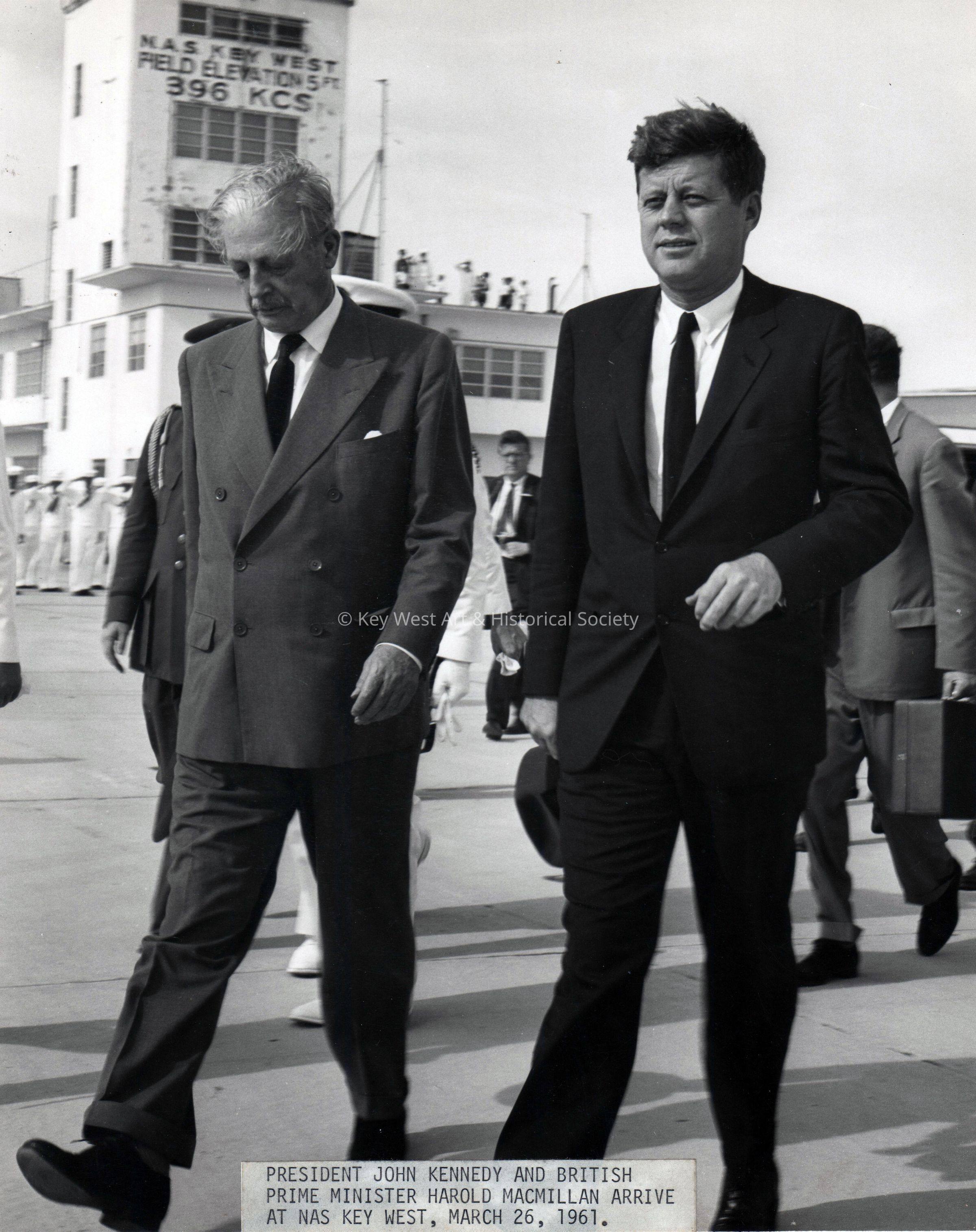 President John Kennedy and British Prime Minister Harold Macmillan arrive at Naval Air Station Key West, on March 26, 1961.