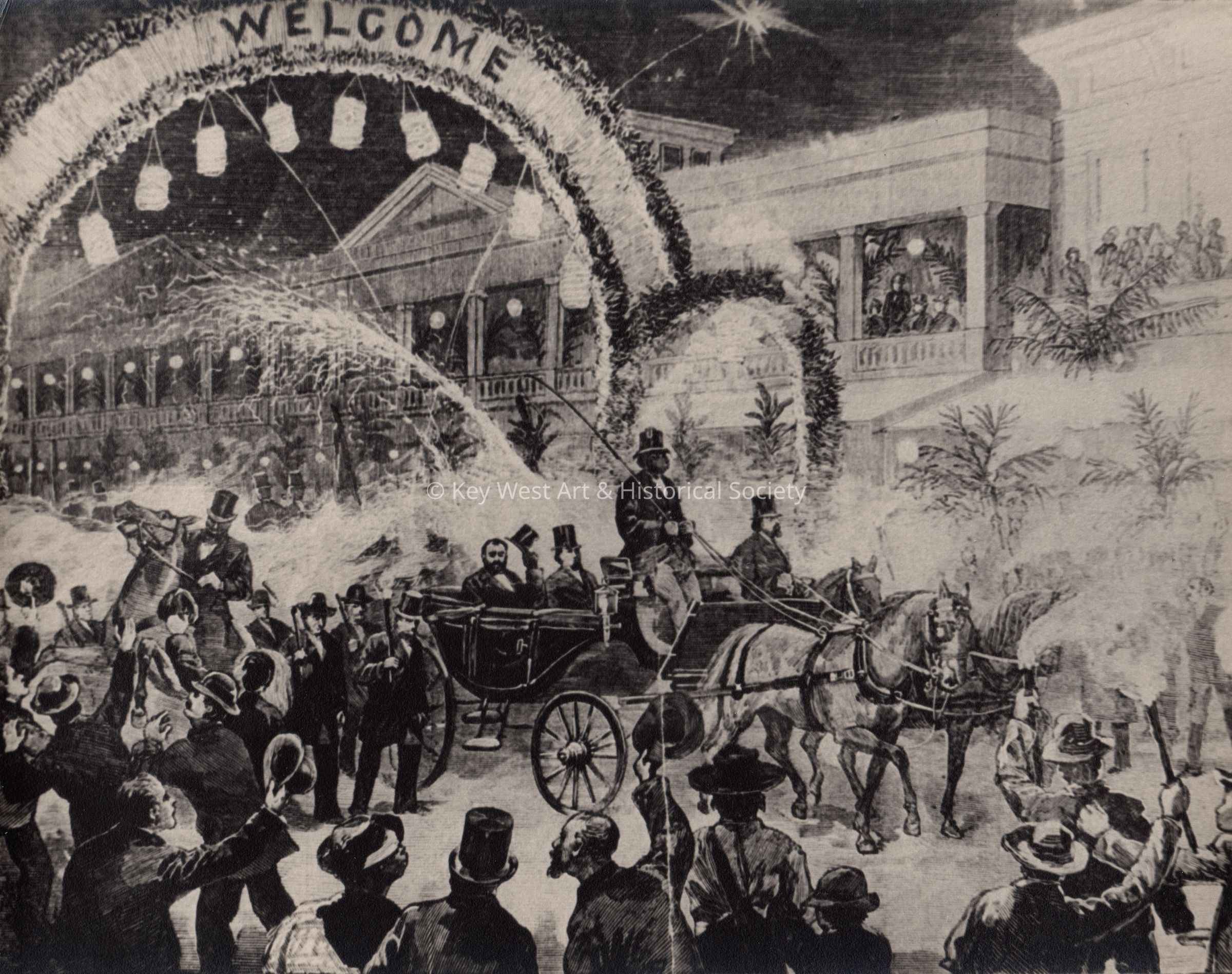 Black and white photograph of former U.S. President Ulysses S. Grant riding in a carriage on Duval Street in front of the Russell House in Key West. Photograph taken from a Harper's Weekly dated February 21, 1880.