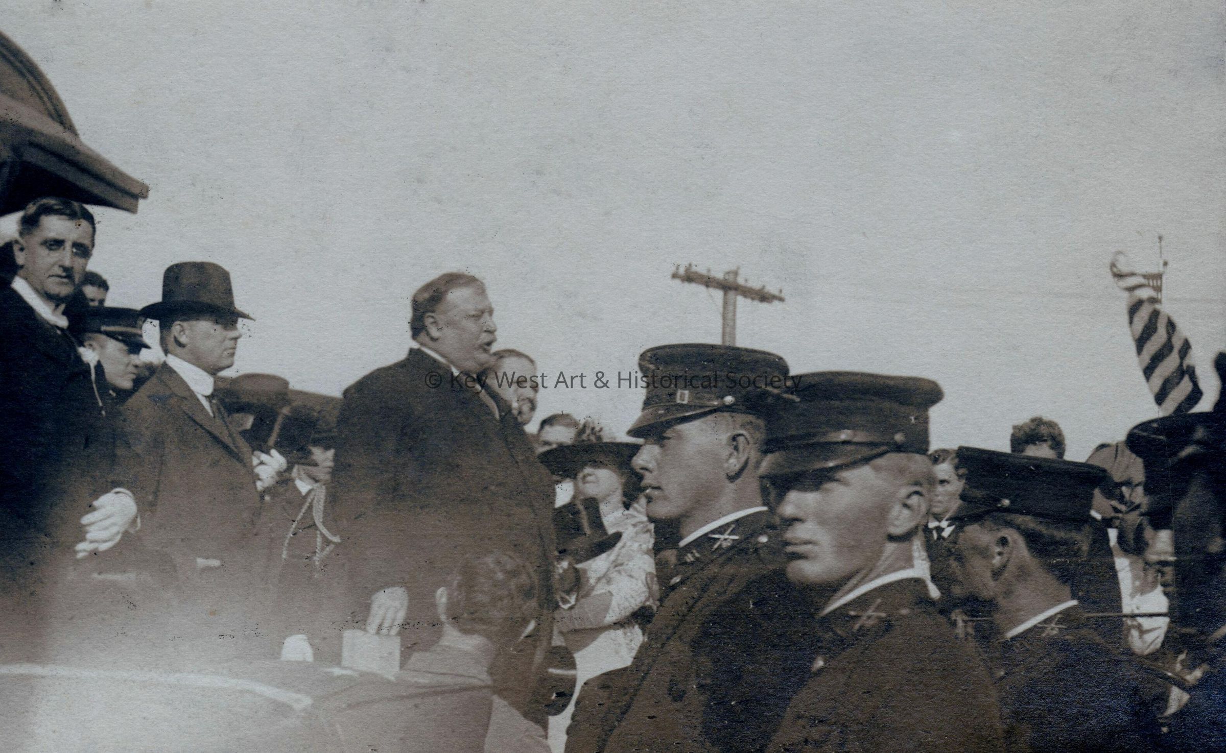 Postcard depicting U.S. President William Howard Taft addressing a crowd following his arrival in Key West. The message on the verso reads, 'President Taft visits Key West Naval Station.' Taft stopped in Key West on his way to inspect construction progress of the Panama Canal.Subject Person/Organization