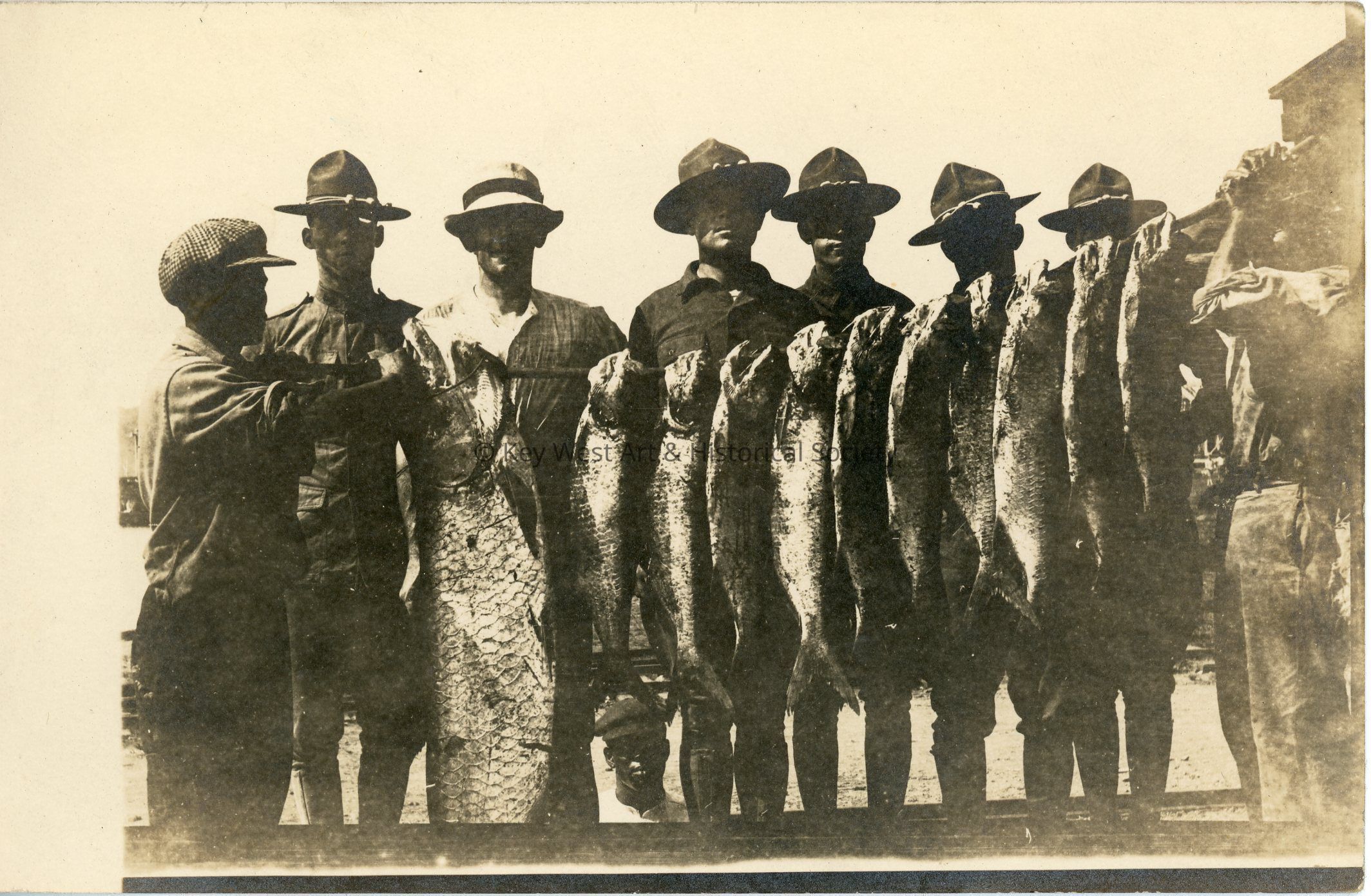 Black and white photograph postcard depicting nine (9) unknown men standing around a pole with hanging fish. Five (5) of the men are in U.S. Army uniform.Subject