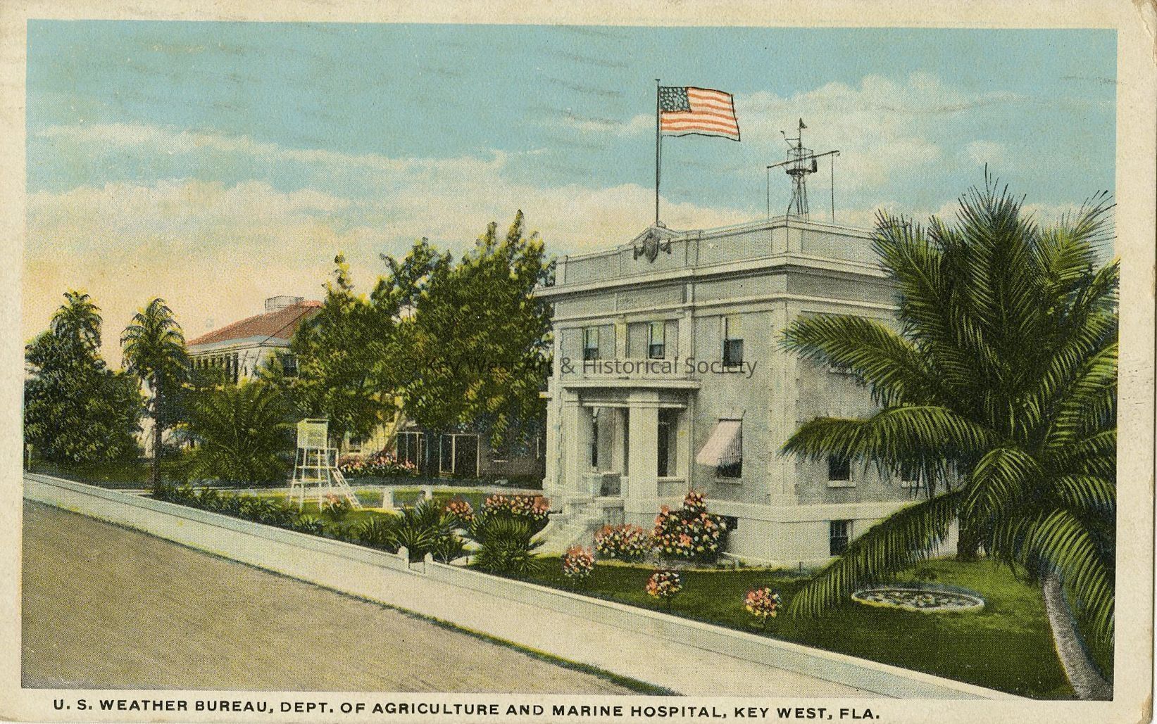 Postcard depicting the U.S. Weather Bureau, Dept. of Agriculture and Marine Hospital, Key West, Florida.Collection