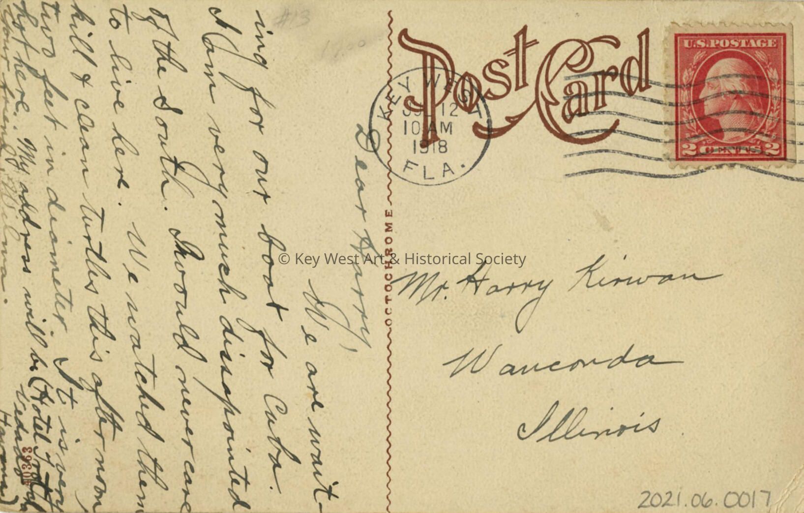 Dear Harry, we are waiting for our boat for Cuba. I am very much disappointed of the South. I would never care to live here. We watched them kill and clean turtles this afternoon, two feet in diameter. It is very hot here. My address will be Hotel Trotcha Vedado Havana. Your friend Wilma.Language