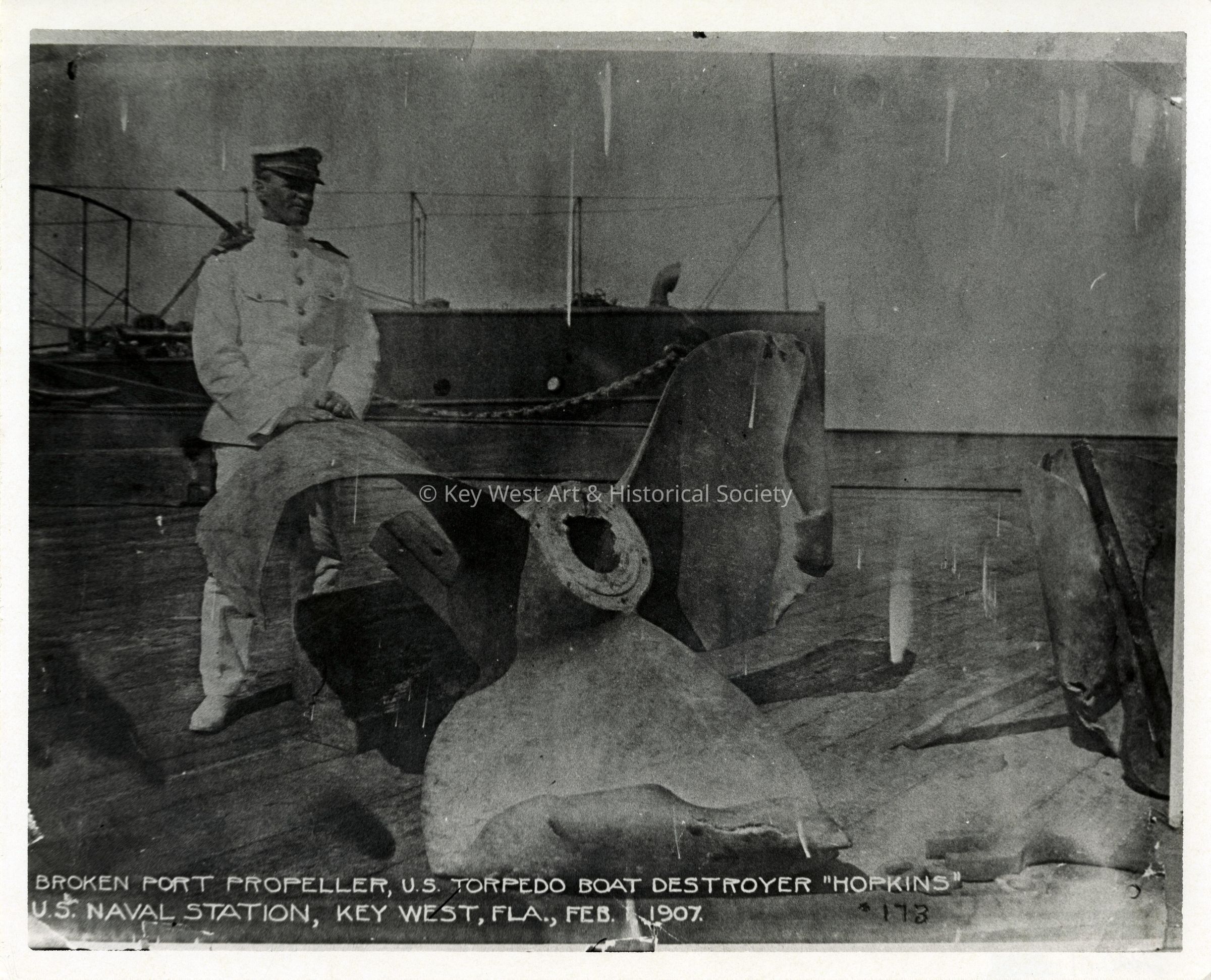 Black and white photograph of a broken port propeller belonging to U.S.S. HOPKINS (DD-6) taken at Naval Station Key West.