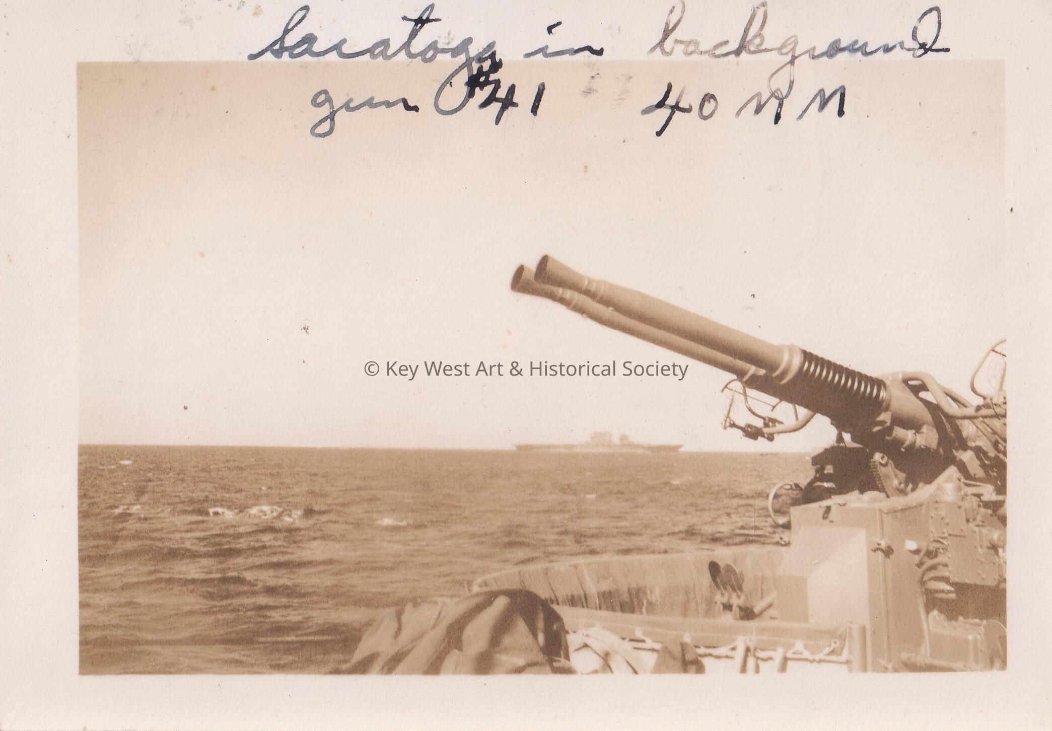 From the U.S.S. Key West (PF-17) in World War II; gun #41, 40MM on ship (Saratoga in background).Collection