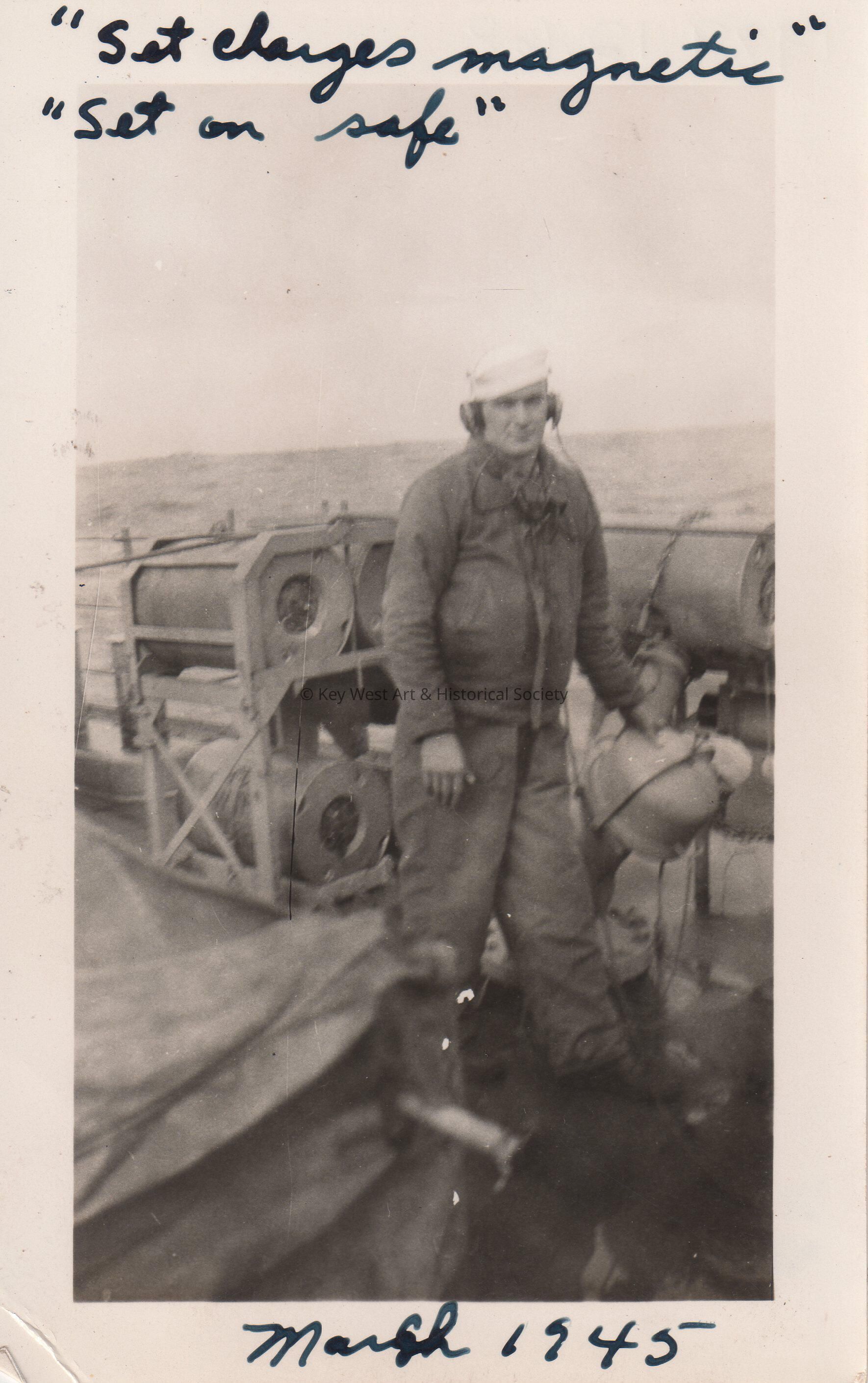 From the U.S.S. Key West (PF-17) in March of 1945; sailor with depth charges.Collection