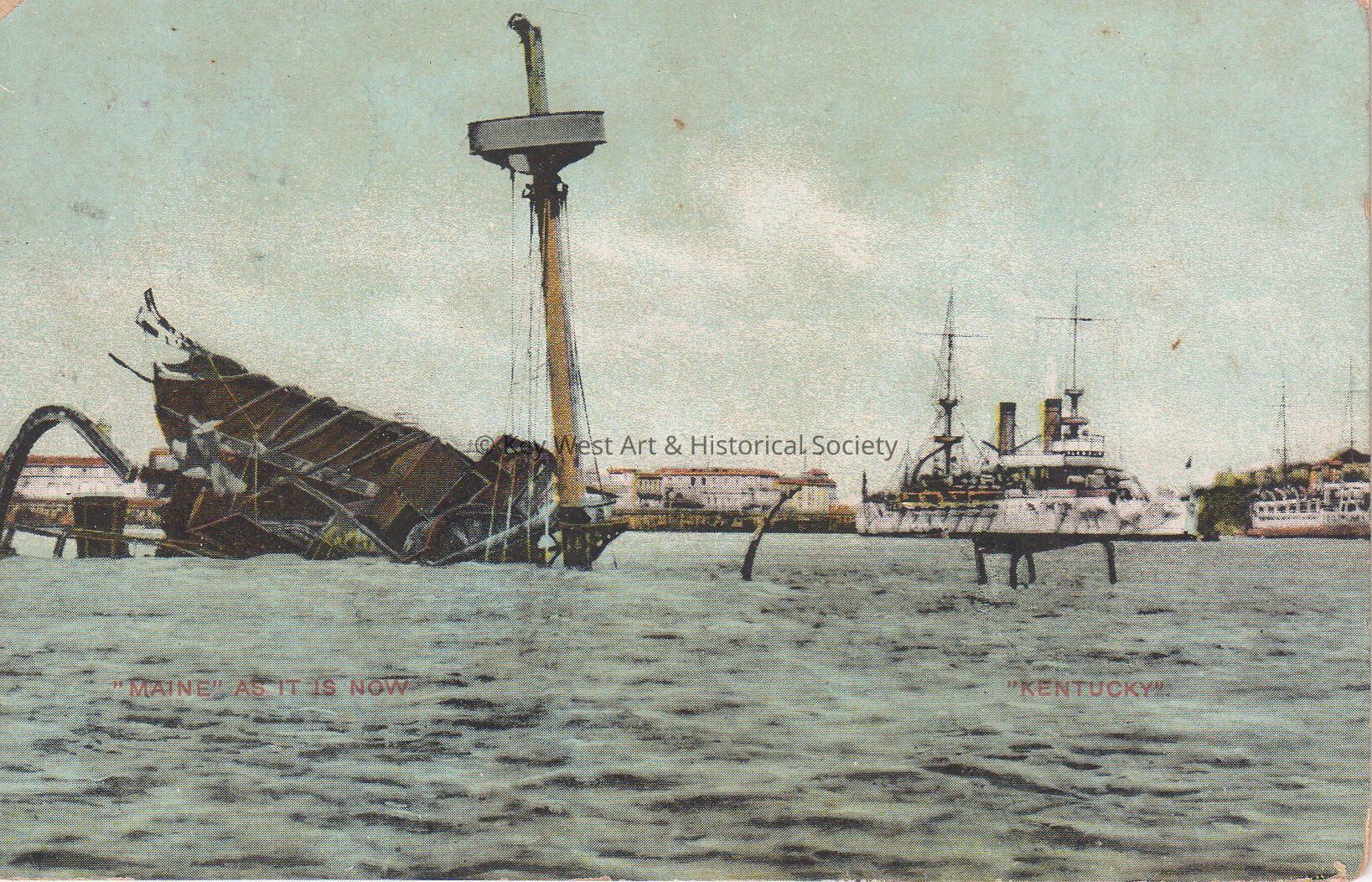 Postcard depicting the wreck of the U.S.S. MAINE in Havana Harbor with the U.S.S. KENTUCKY alongside. The caption reads, '"Maine' as it is now "Kentucky"'.Subject Place