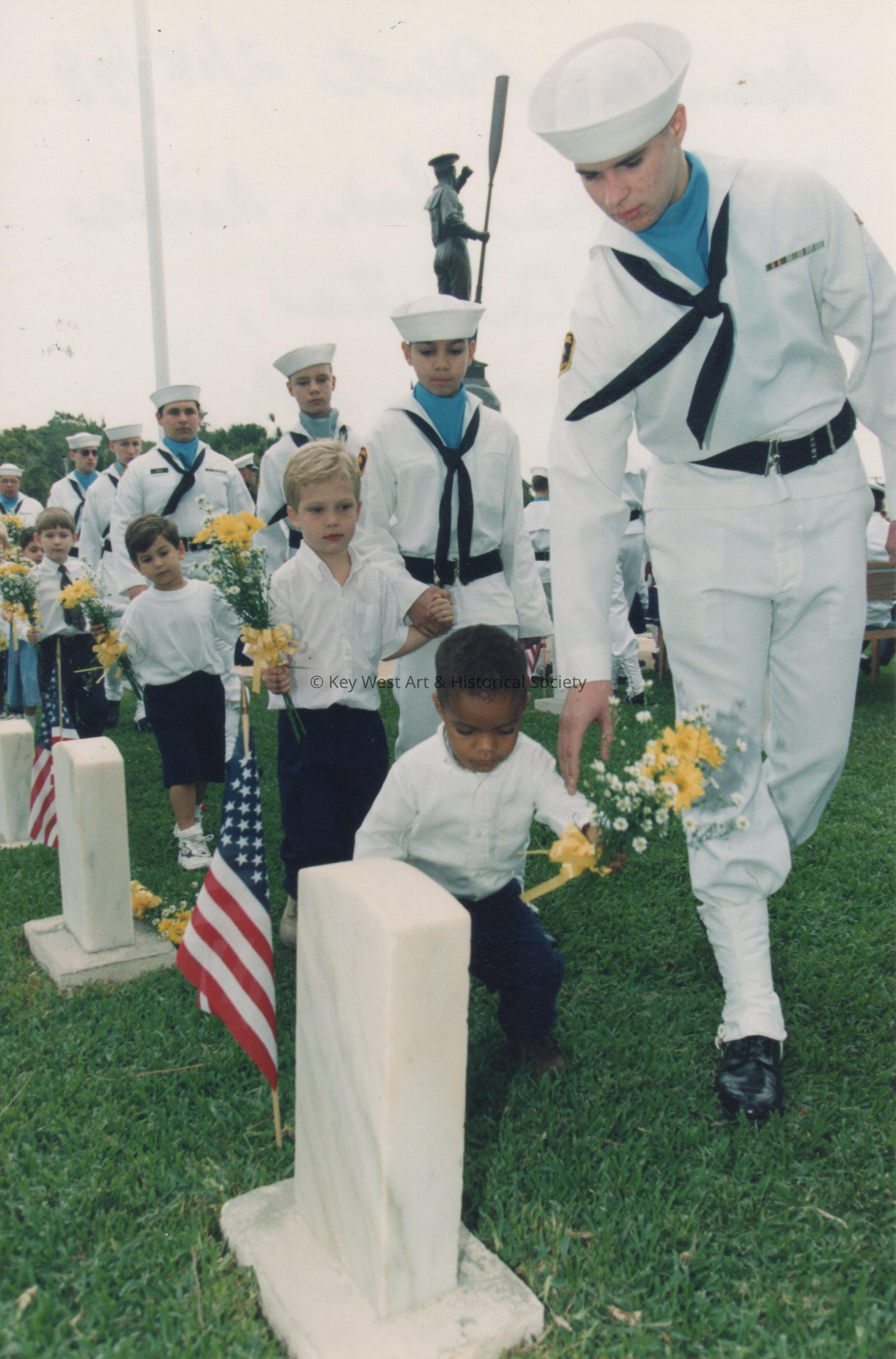 U.S.S. MAINE Centennial Celebration at the Key West cemetery plot, on February 15, 1998. Montessori School children and sea cadets from Reading, PA, place flowers on the graves.Collection