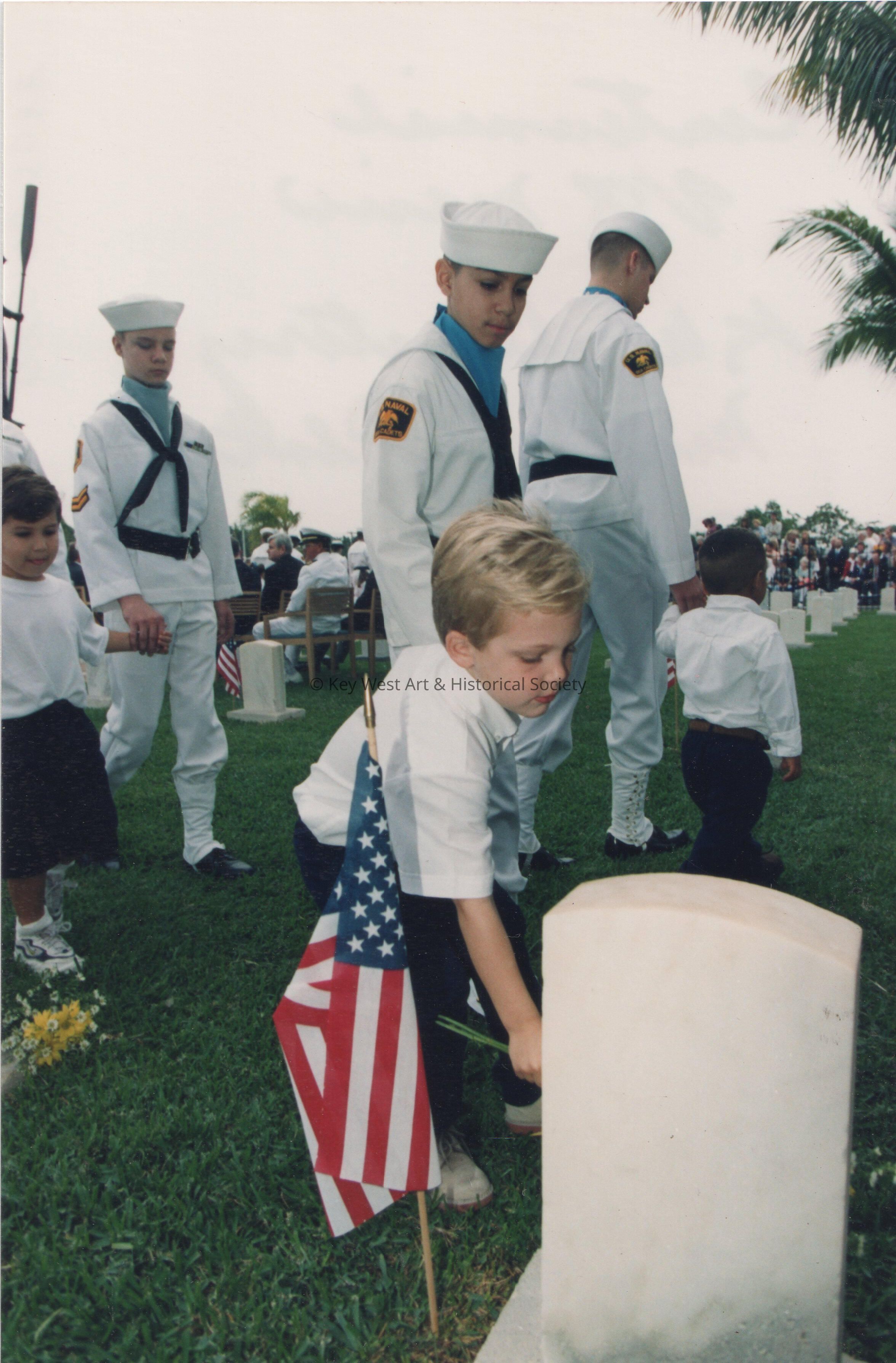 Color photograph of the U.S.S. MAINE Centennial Celebration at the Key West cemetery plot, on February 15, 1998. Montessori School children and sea cadets from Reading, PA, place flowers on the graves.Photograph Details