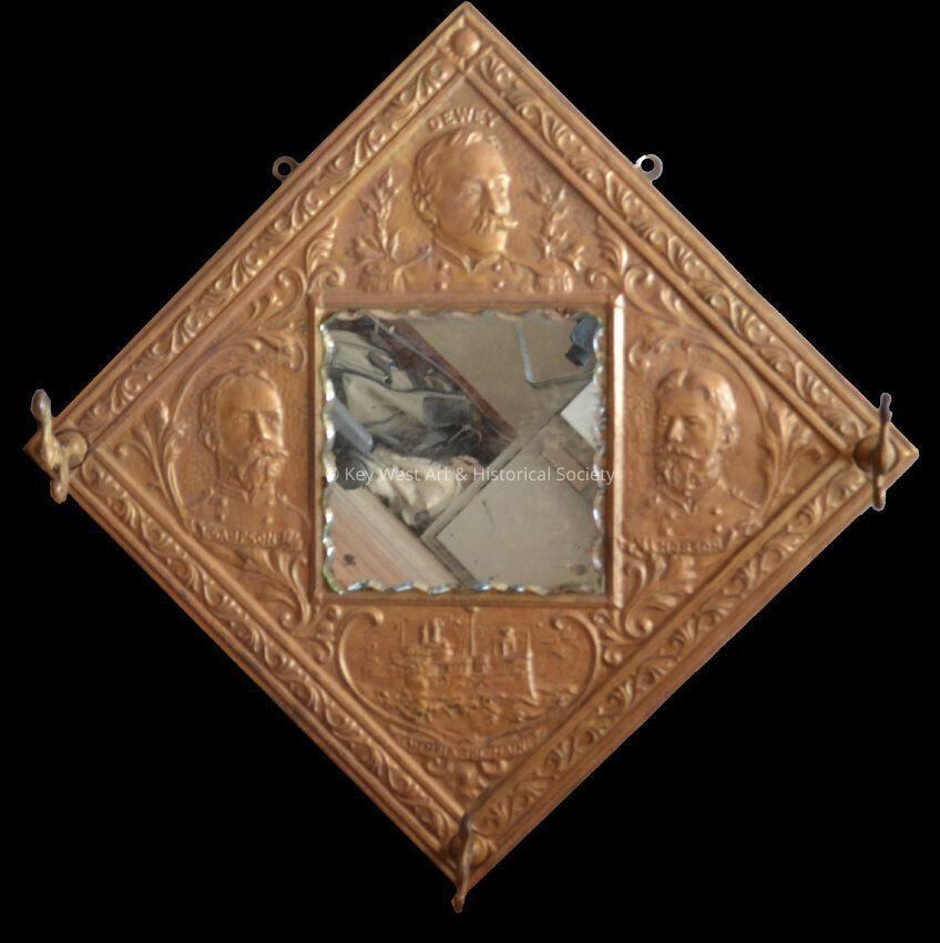 A decorative U.S.S. Maine mirror which depicts the ship, the head of Admiral Dewey, Admiral Hobson and Admiral Sampson. 'Remember the Maine' is printed below the ship. There are three decorative metal hooks on the front of the mirror, presumably for hanging textiles such as hats and scarves.Collection