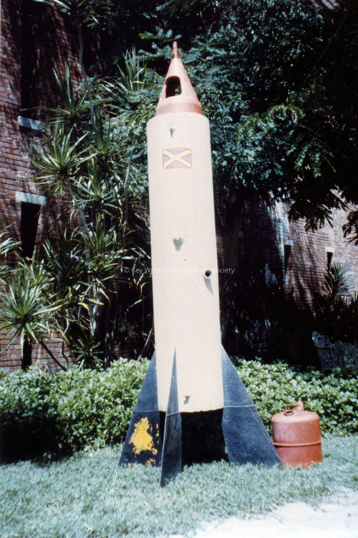 Freestanding sculpture by Stanley Papio depicting a rocket and fuel tank standing upright on four sheet metal fins.Type of Sculpture