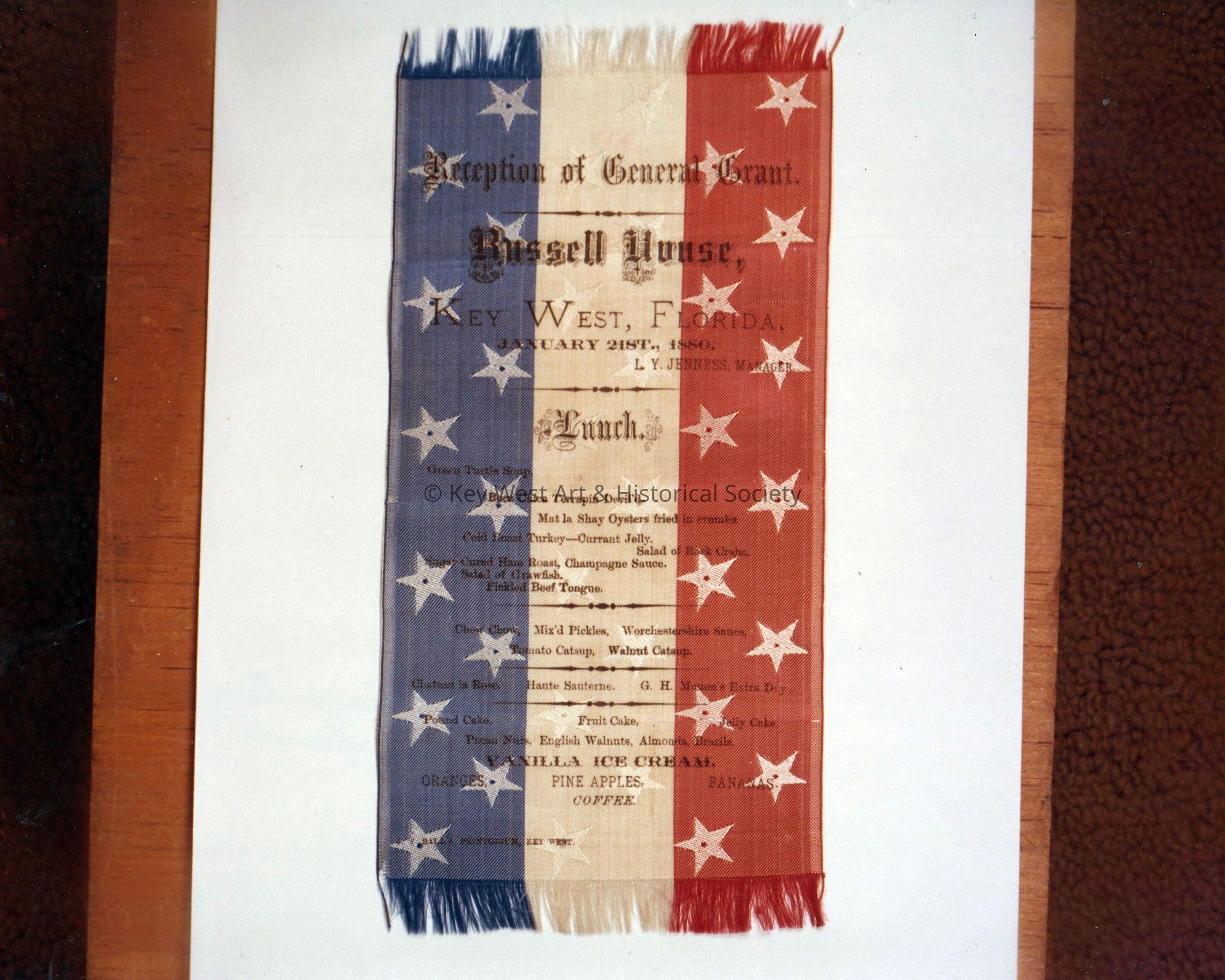 Color photograph of the silk menu from the reception held for former U.S. President Ulysses S. Grant at the Russell House in Key West.