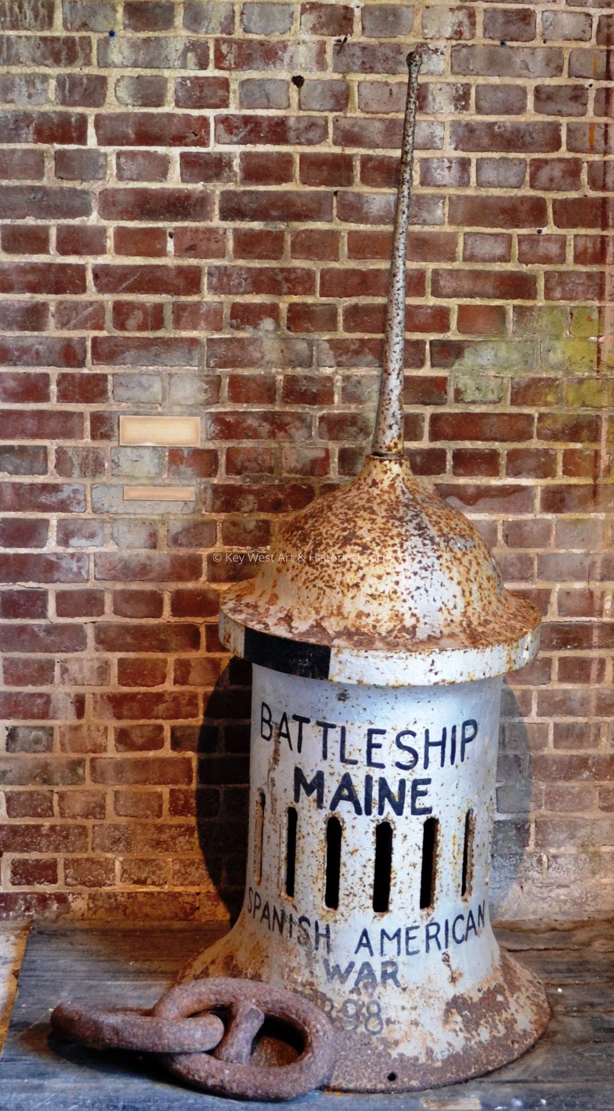 Bell-shaped steel object with post rising from the top and vents in the center. "Battleship Maine Spanish American War 1898" hand painted on the front.Collection