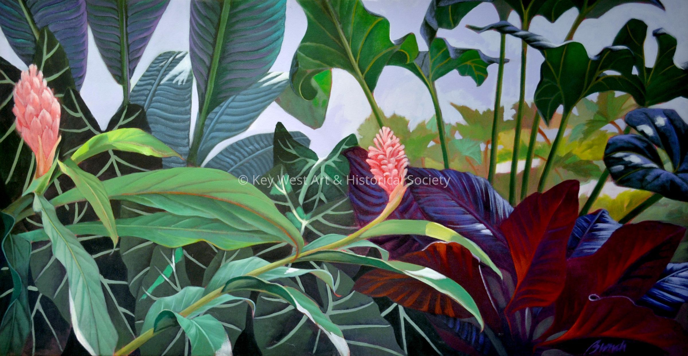 Oil painting by Craig Biondi depicting a lush tropical setting including ginger plants and flowers under a ylang ylang tree that is visible in the background. The composition beautifully captures the rich textures and vivid hues typically found in a tropical setting, creating a sense of depth and natural abundance. The meticulous brushwork emphasizes the leaves' intricate veins, enhancing the realism of this botanical artwork.Type of Painting
