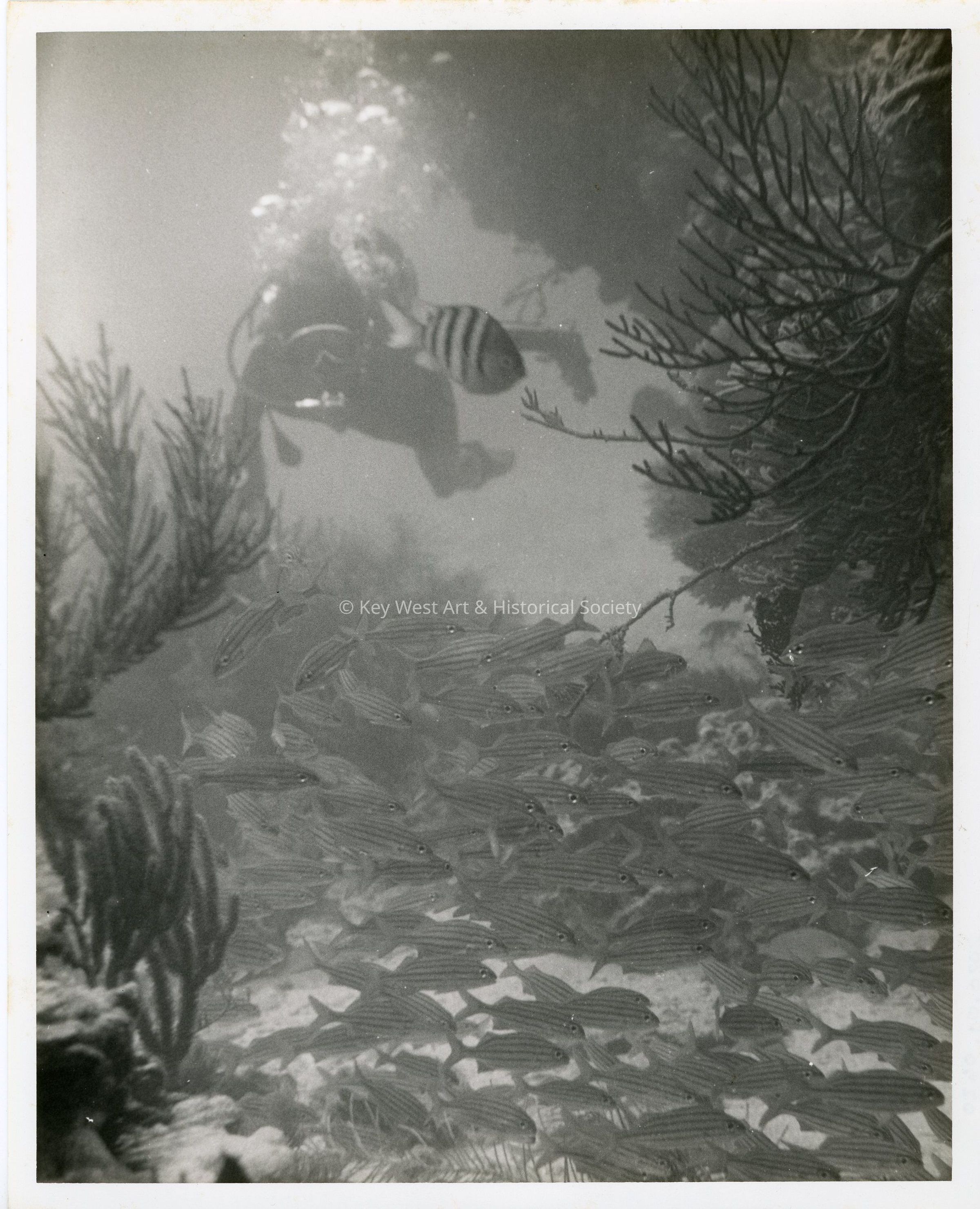 Black and white photograph of an underwater scuba diver with a school of fish near the coral reef off the Florida Keys.