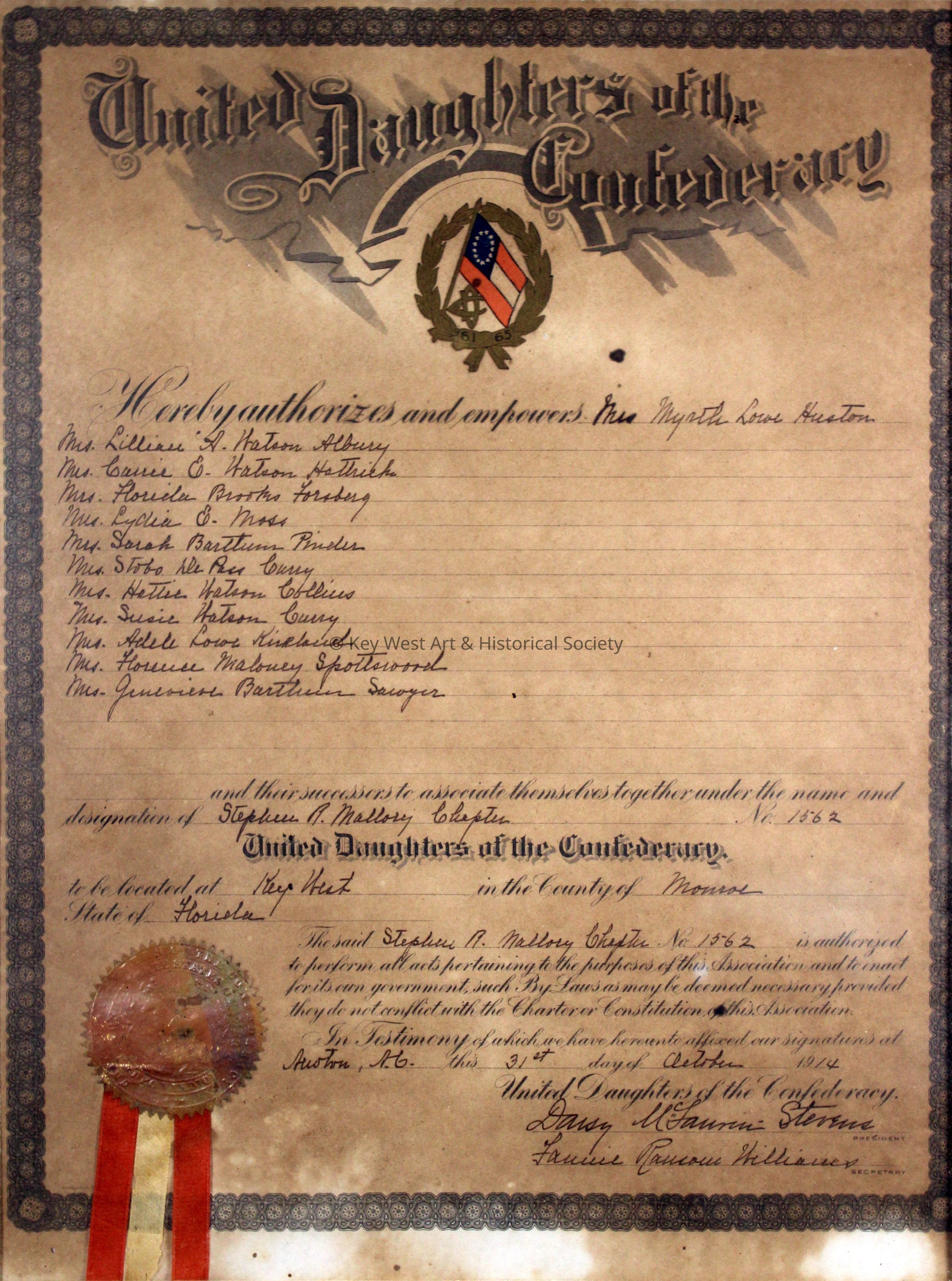 United Daughters of the Confederacy document authorizing the Stephen R. Mallory Chapter No. 1562 to function in Key West. Women named on the document include Albury, Hattrick, Forsbery, Moss, Pinder, Curry, Collings, Kirkland, Spottswood, Sawyer, and Huston.Collection