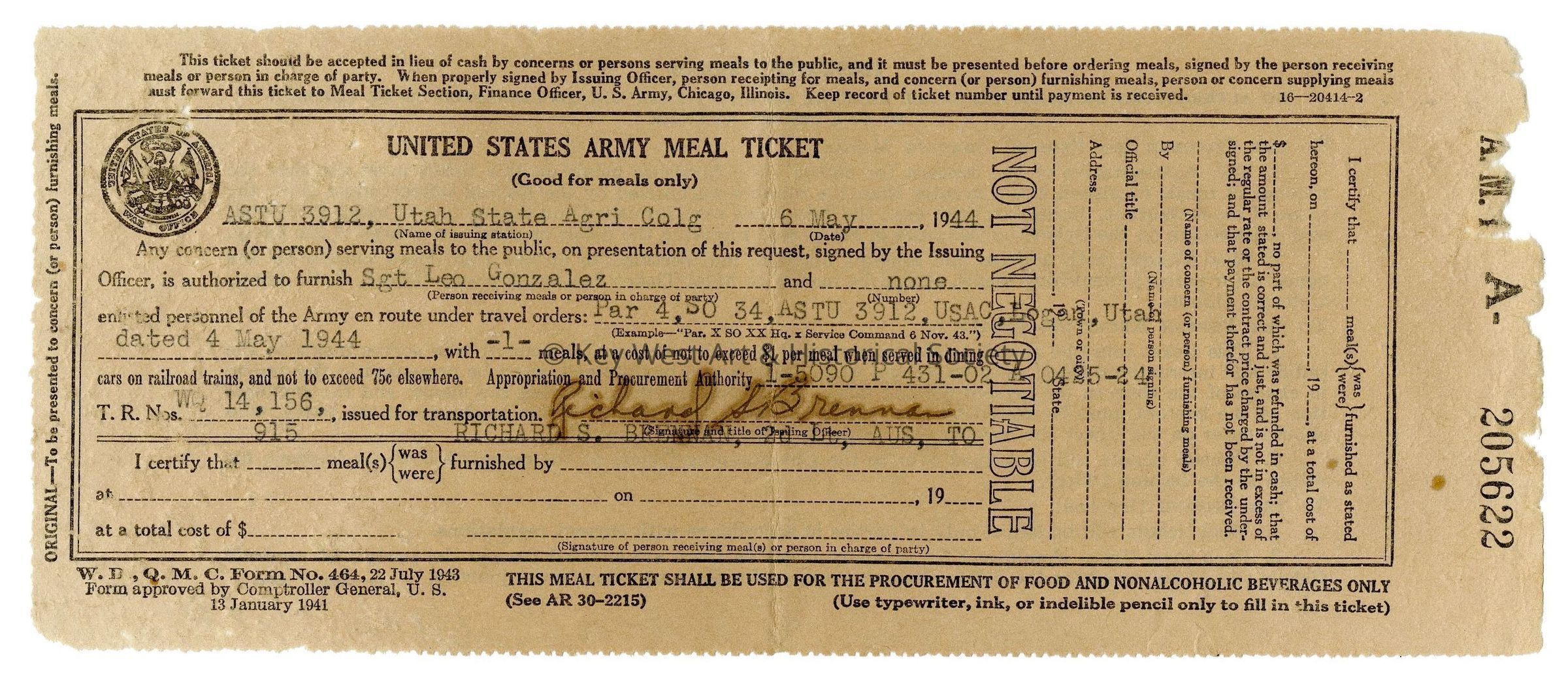 Paper World War II United States army meal ticket issued to Sergeant Leo Gonzalez for one meal dating May 6, 1944.Collection