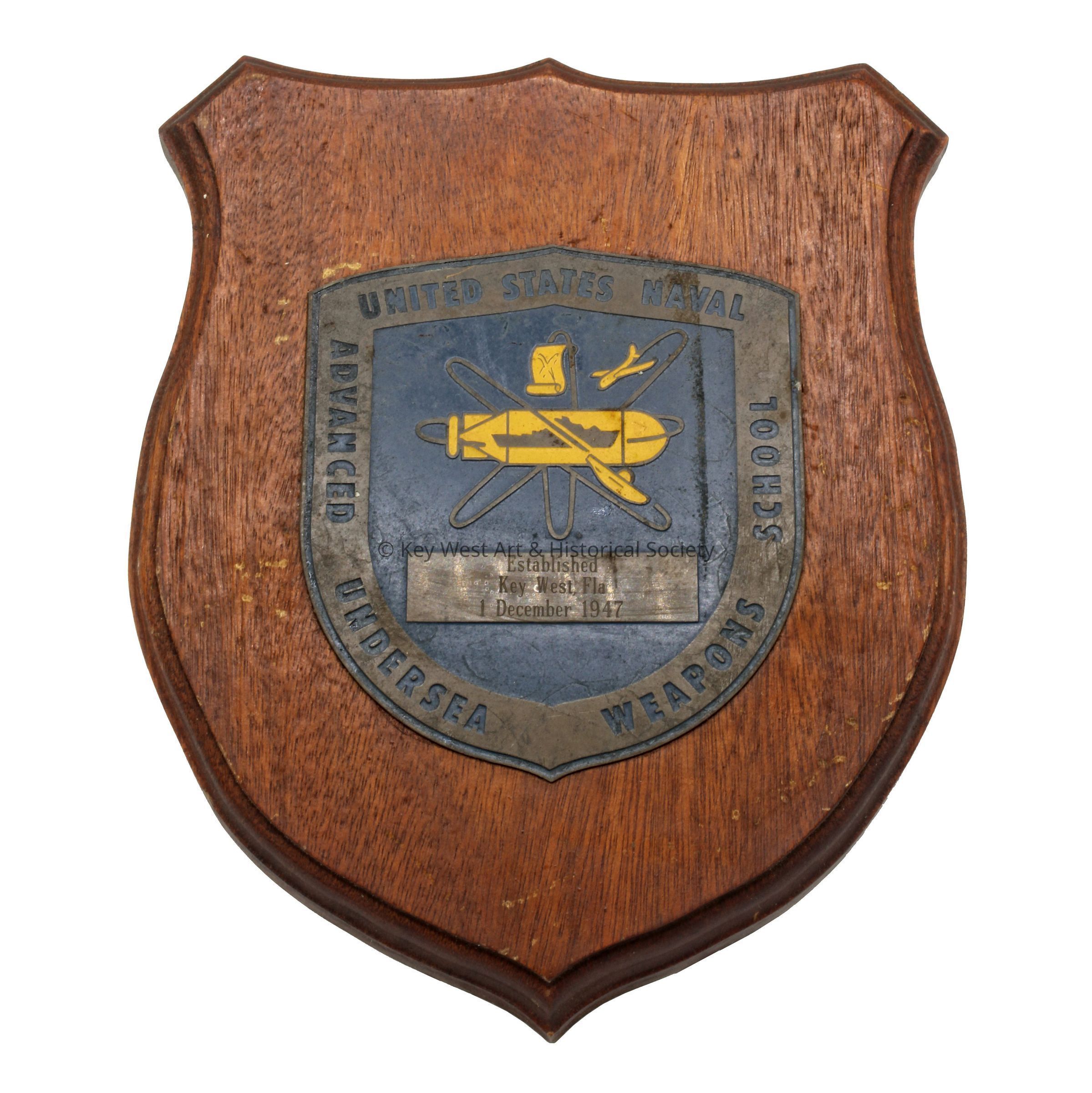 Brass on wood plaque commemorating United States Naval Advanced Undersea Weapons School. "Established Key West 1 December 1957" on brass placard.