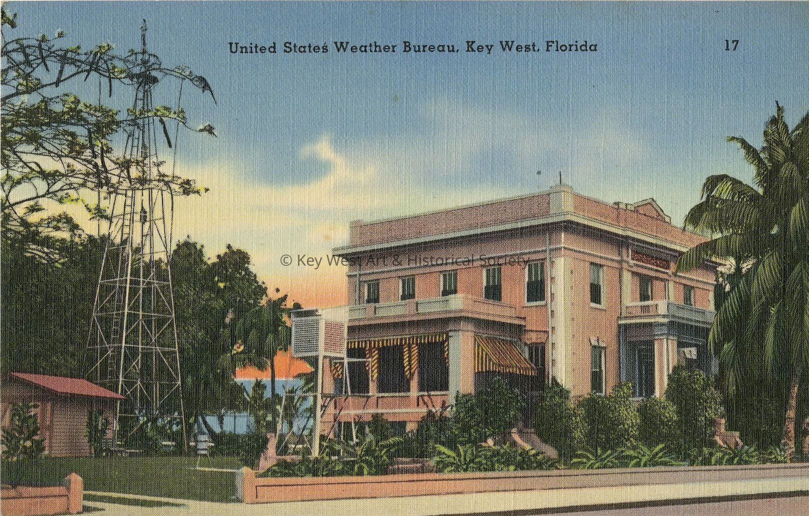 Postcard depicting the United States Weather Bureau in Key West, Florida. Notation on verso, 'Blessed with a fine climate, excellent fishing waters and lush tropic beauty, Key West is attracting more and more tourists to he hospitable shores. The United States Weather Bureau maintains an excellent plant on this Southernmost City of the United States.'Subject Place