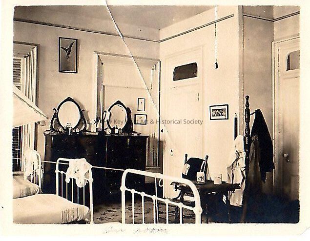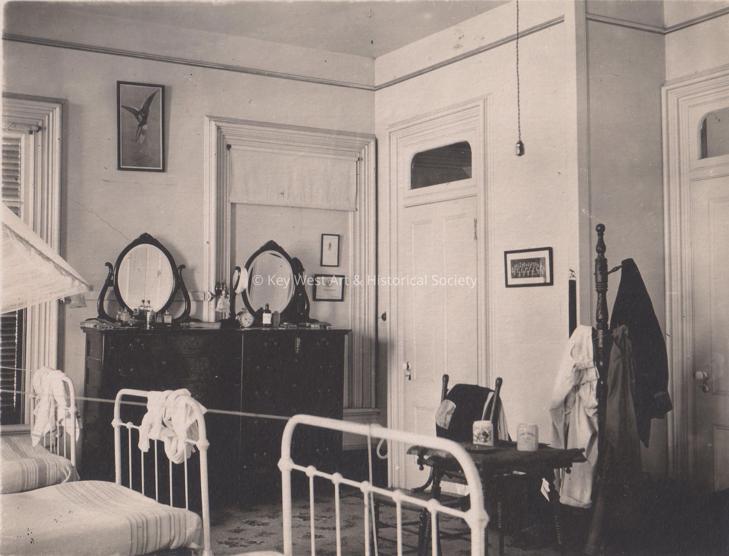 Black and white photograph of an unknown bedroom, note on back reads "our room".Collection