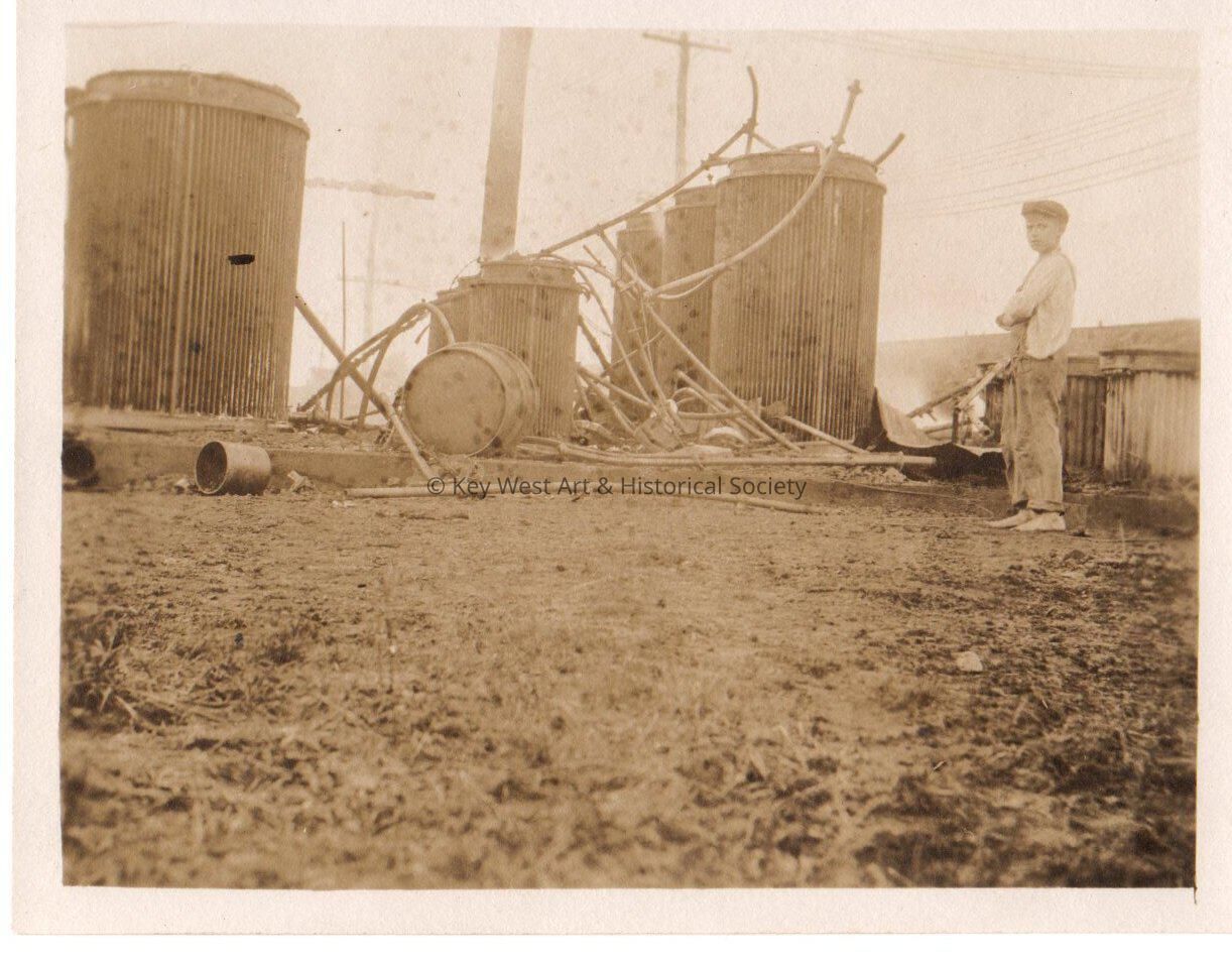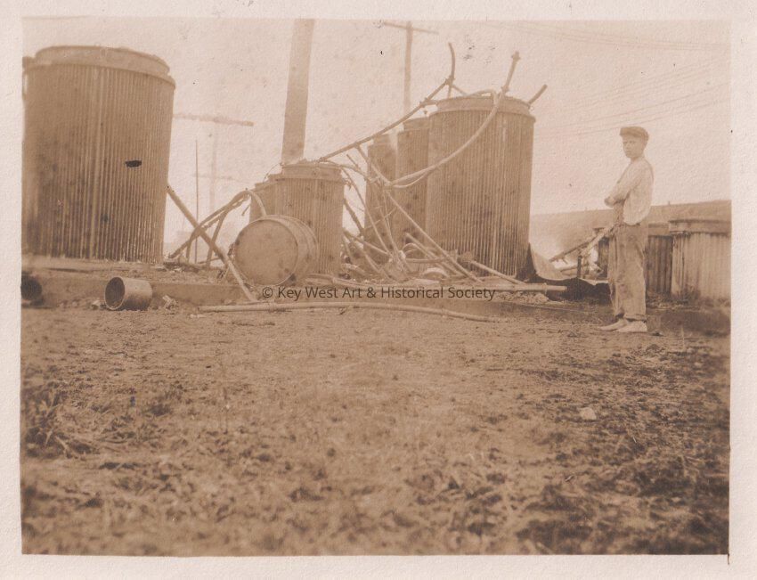 Black and white photo of a boy standing next to damaged electrical equipment caused by a storm. Blackstone Gas and Electric Co.Collection