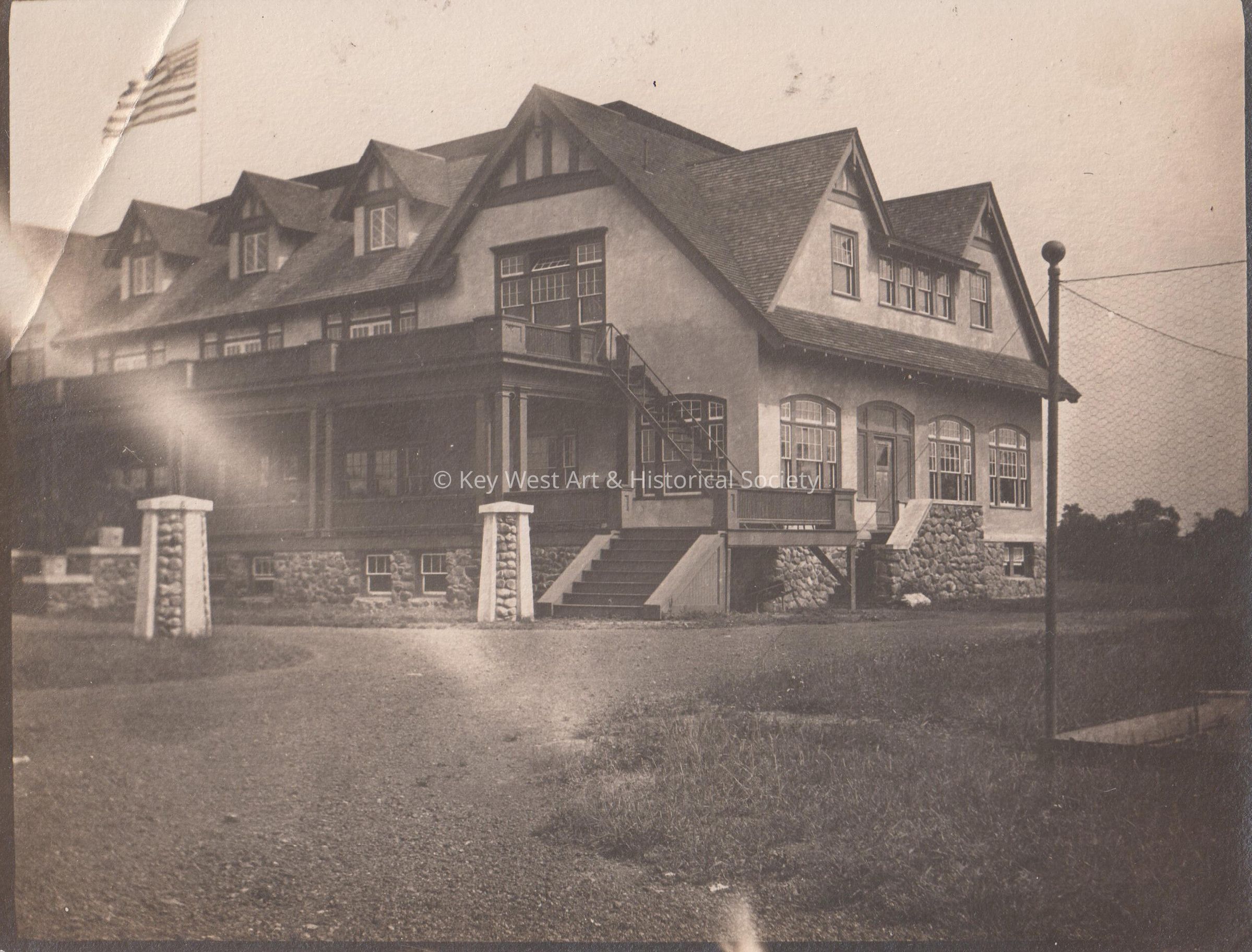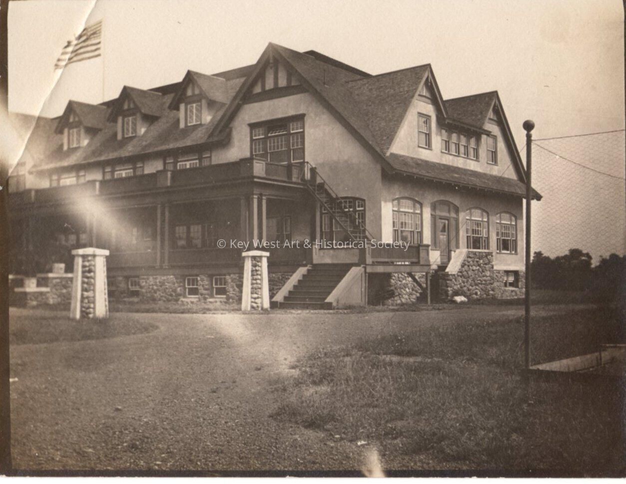 Black and white photograph of an unknown building with an American flag in the background.Collection