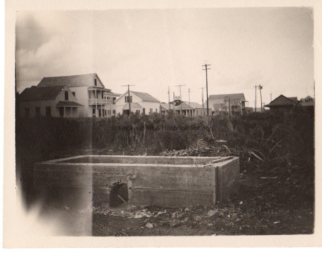 Black and white photo taken after the 1910 hurricane showing the storm damage. Image shows houses on one side of the street and a overgrown field on the other side.Collection