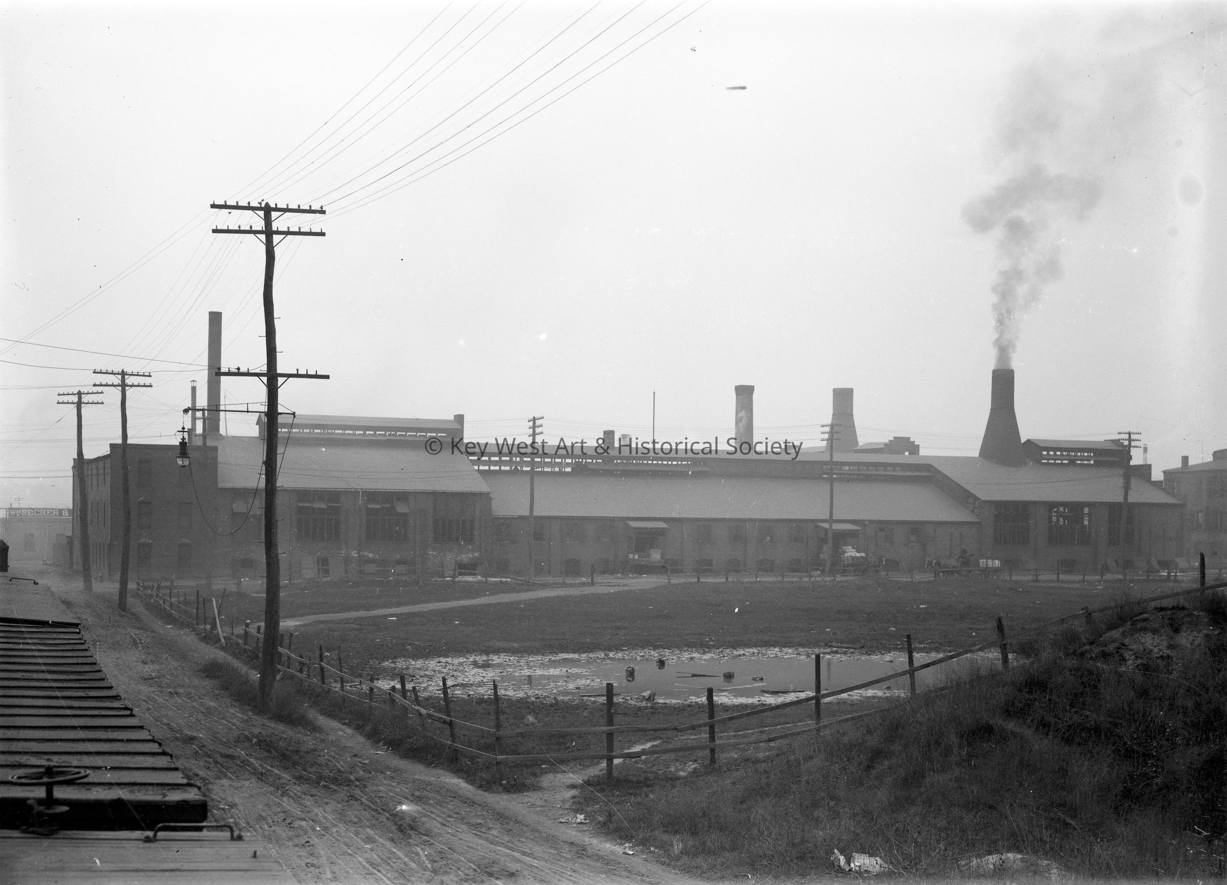 Black and white dry plate glass negative of an industrial factory near train tracks, possibly Baltimore.