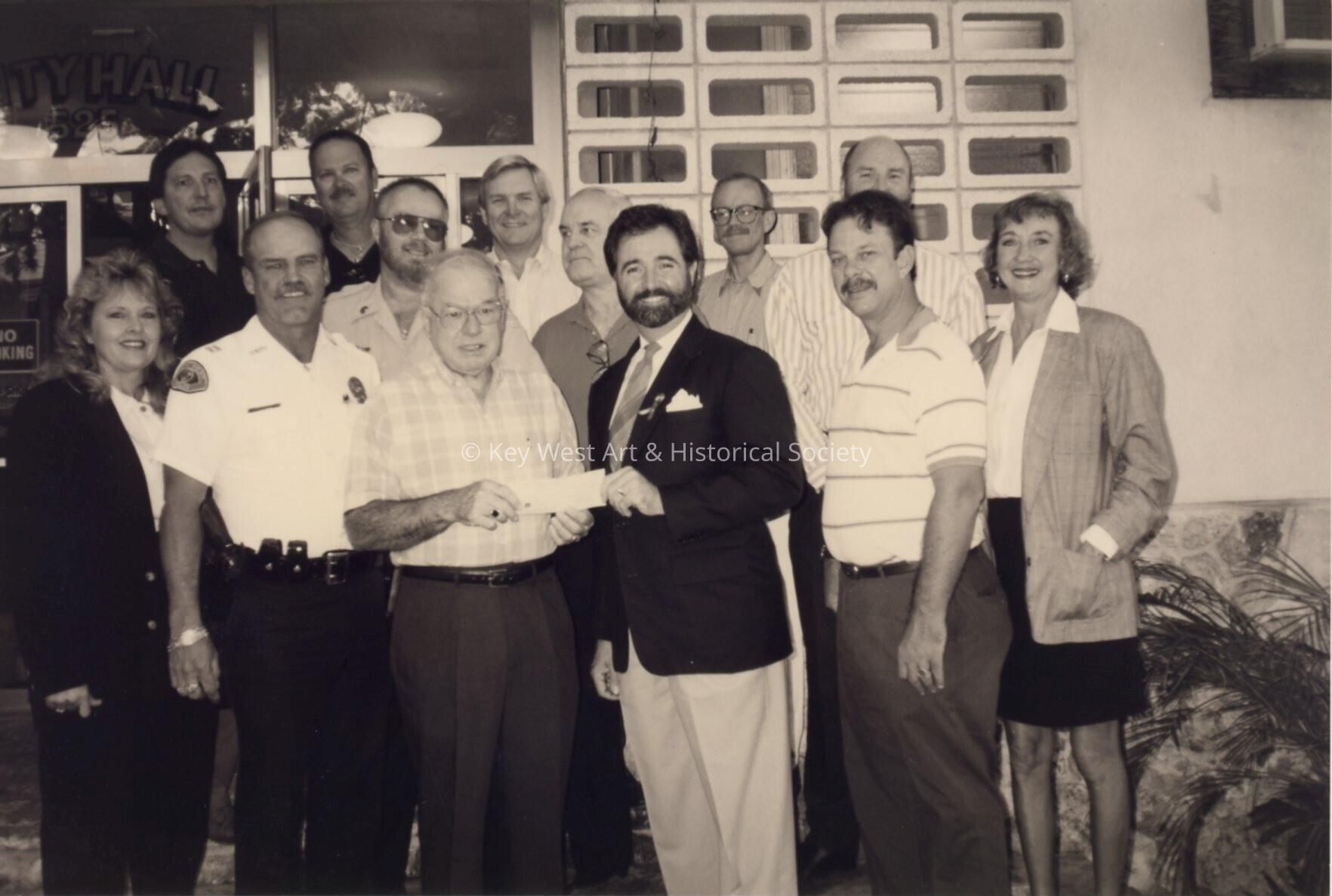 Unknown group of people standing in front of the City Hall. One is accepting a check.Collection