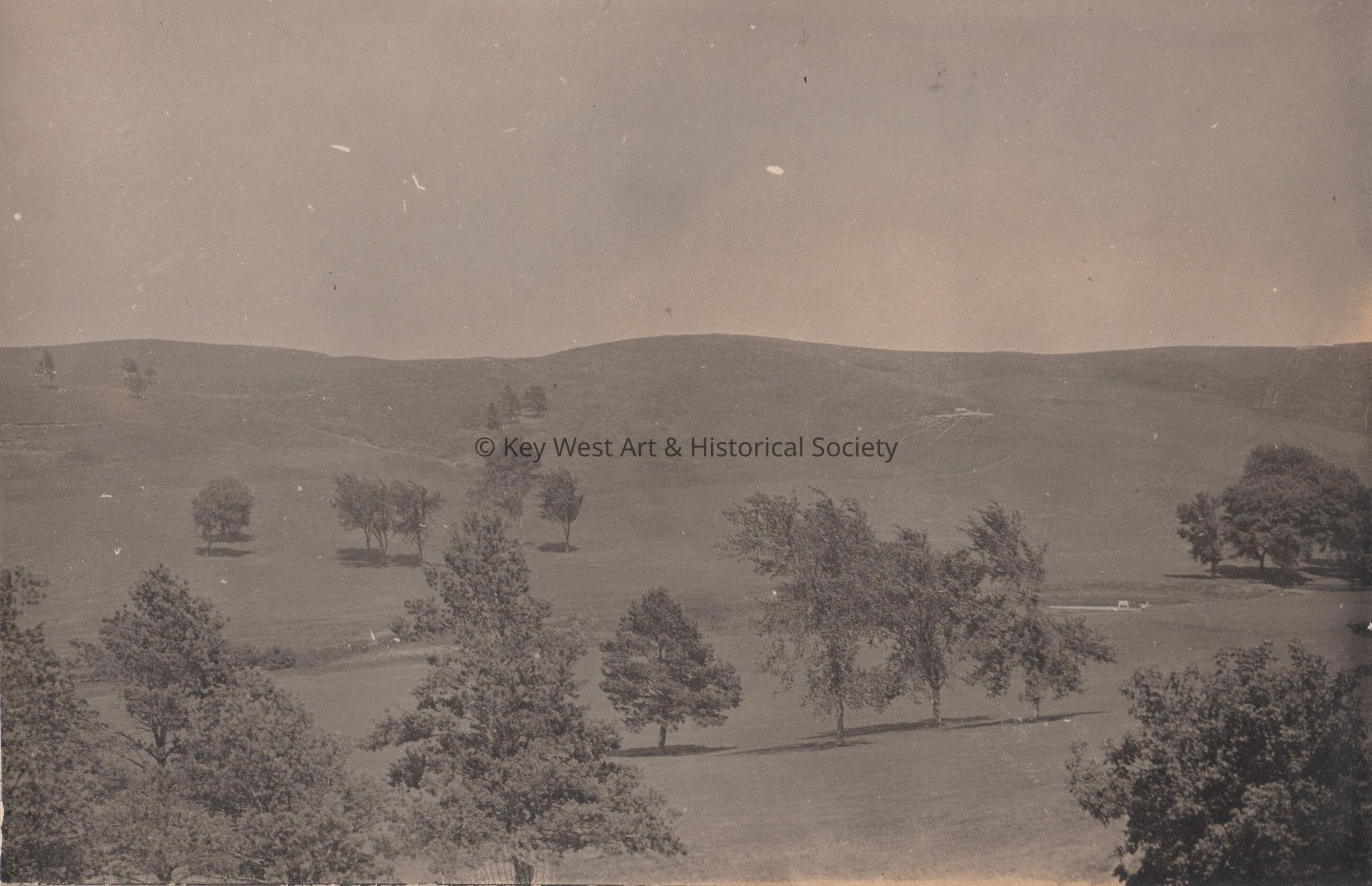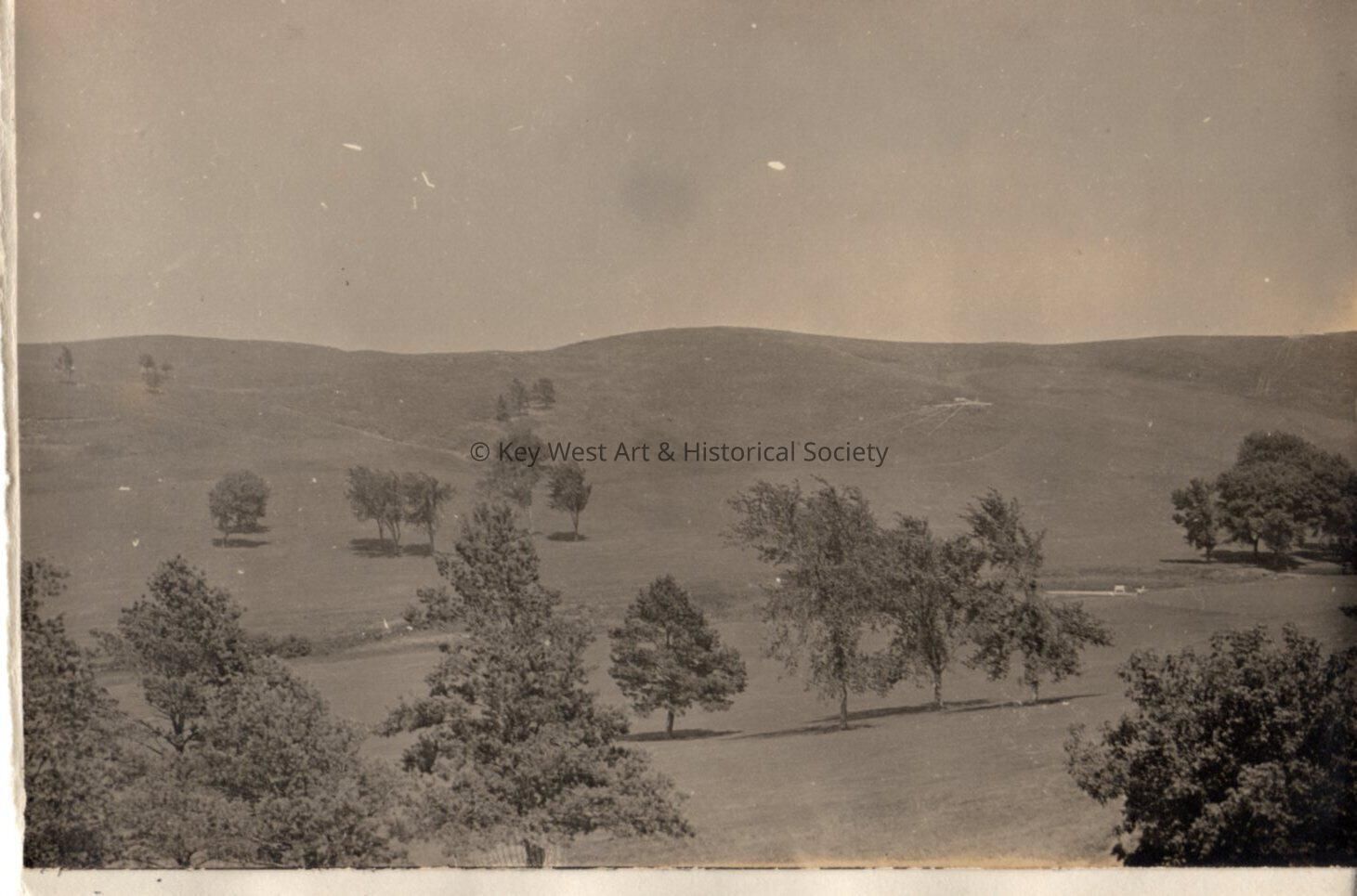 Black and white photo of hills and fields with trees.