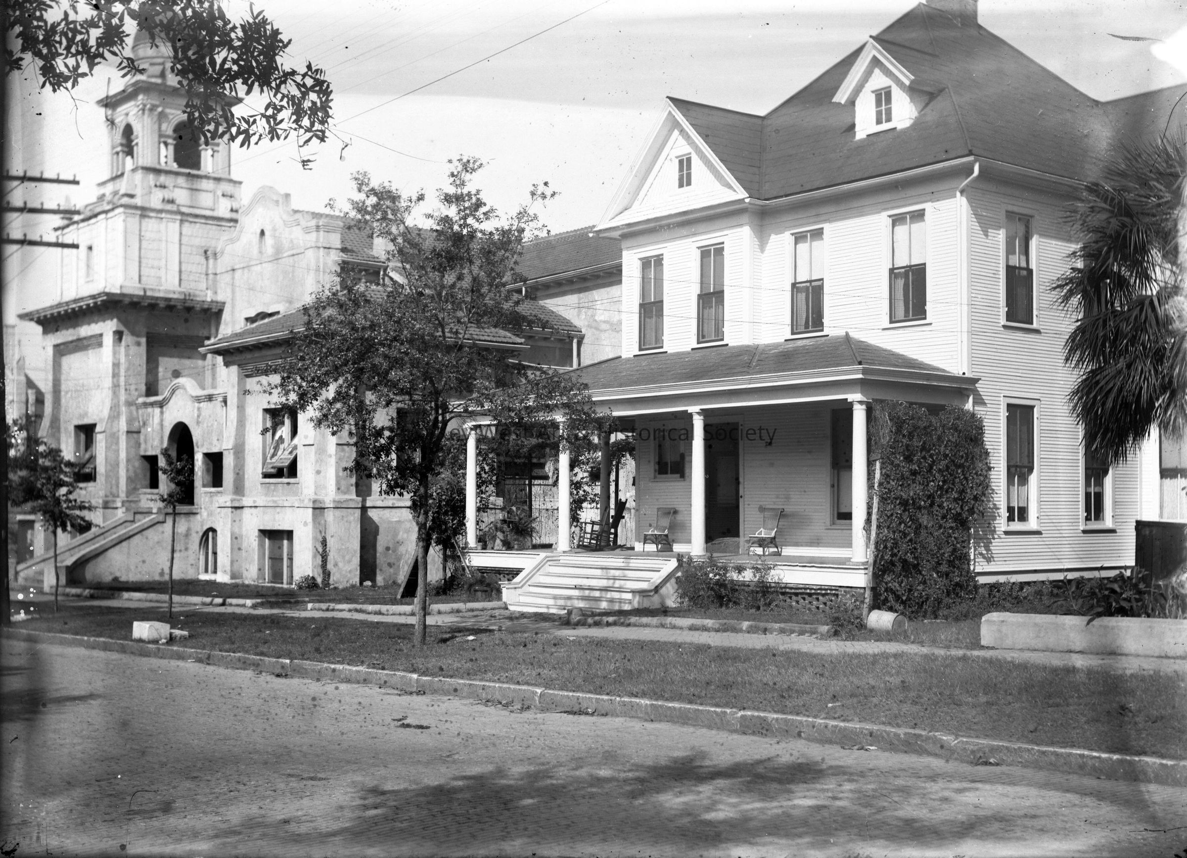 Black and white dry plate glass negative of an unknown home and church in an unknown location.