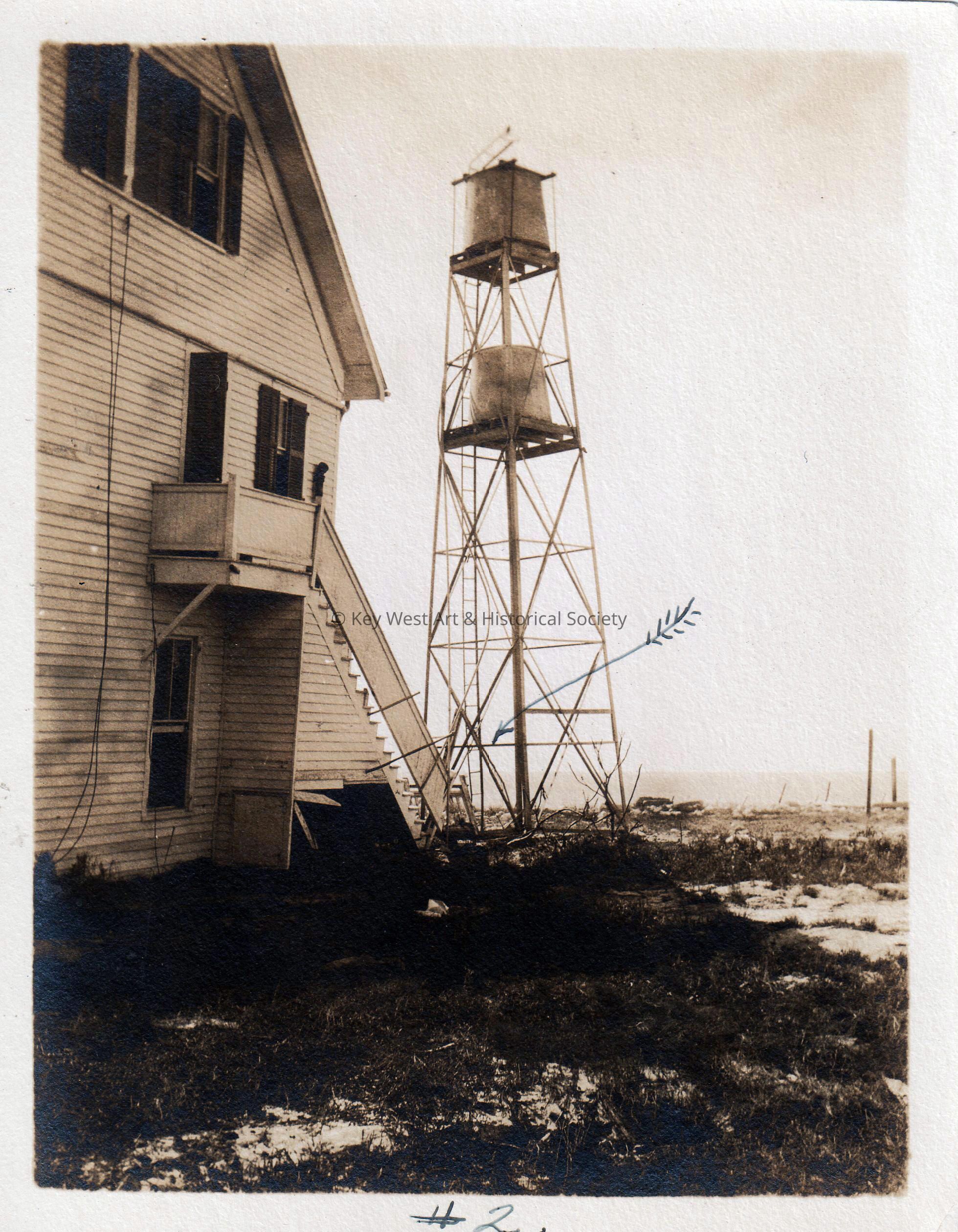 Black and white photo of an unknown house and water tower taken after the 1910 hurricane showing storm damage.