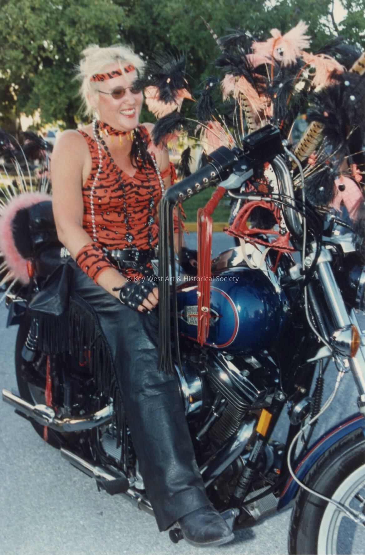 Unknown lady dressed up on a motorcycle.