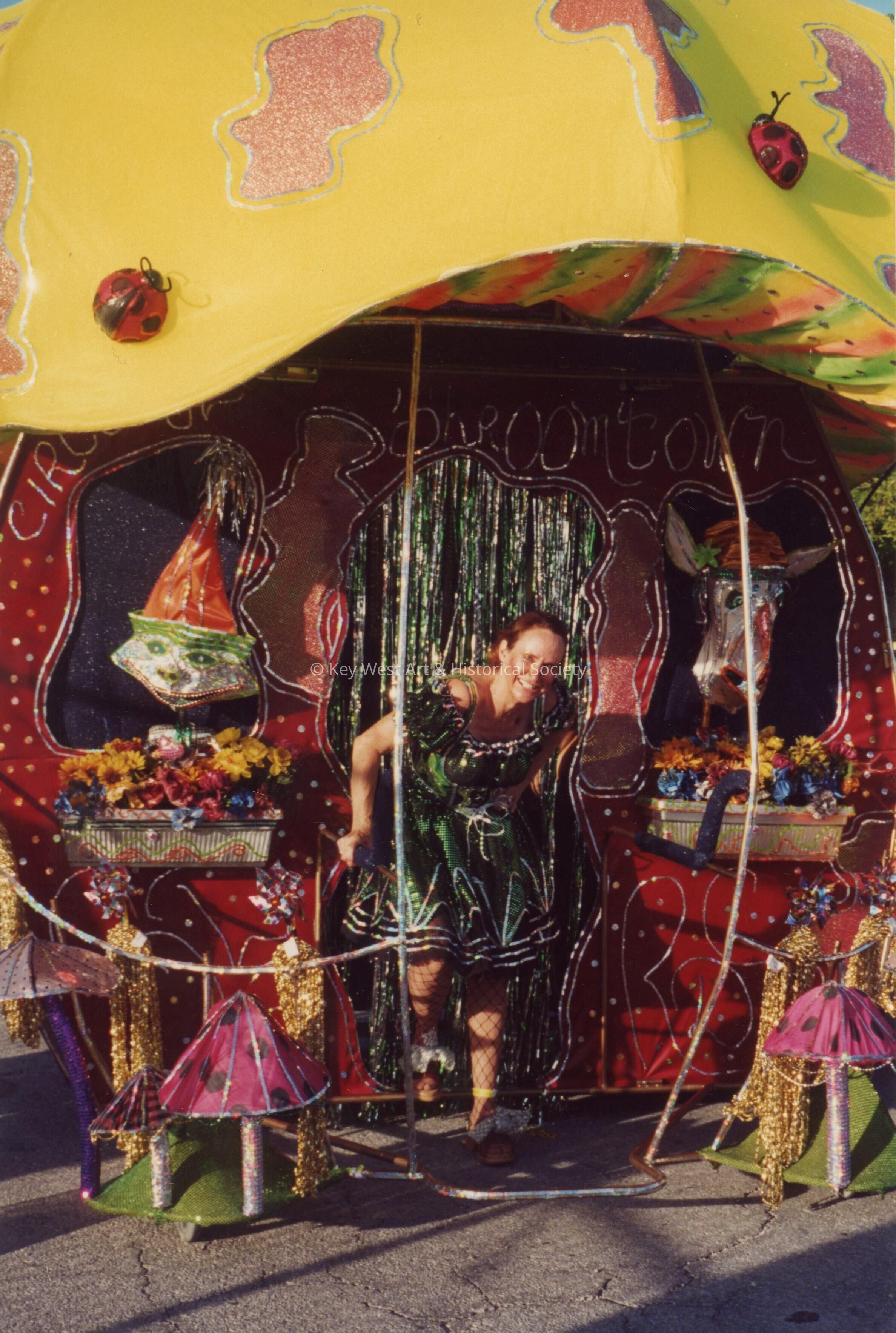 Unknown lady dressed up, standing with a float.Collection