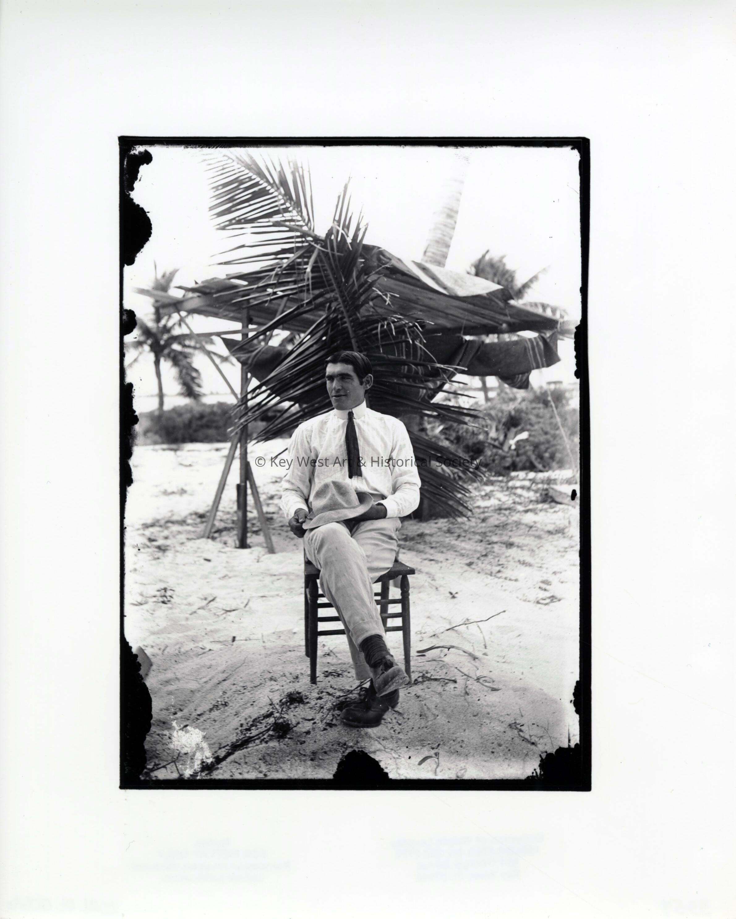 Black and white print taken from a dry plate glass negative of an unknown man at the railroad camp on Pigeon Key. The image was taken during the construction of Seven Mile Bridge on the Overseas Railway.