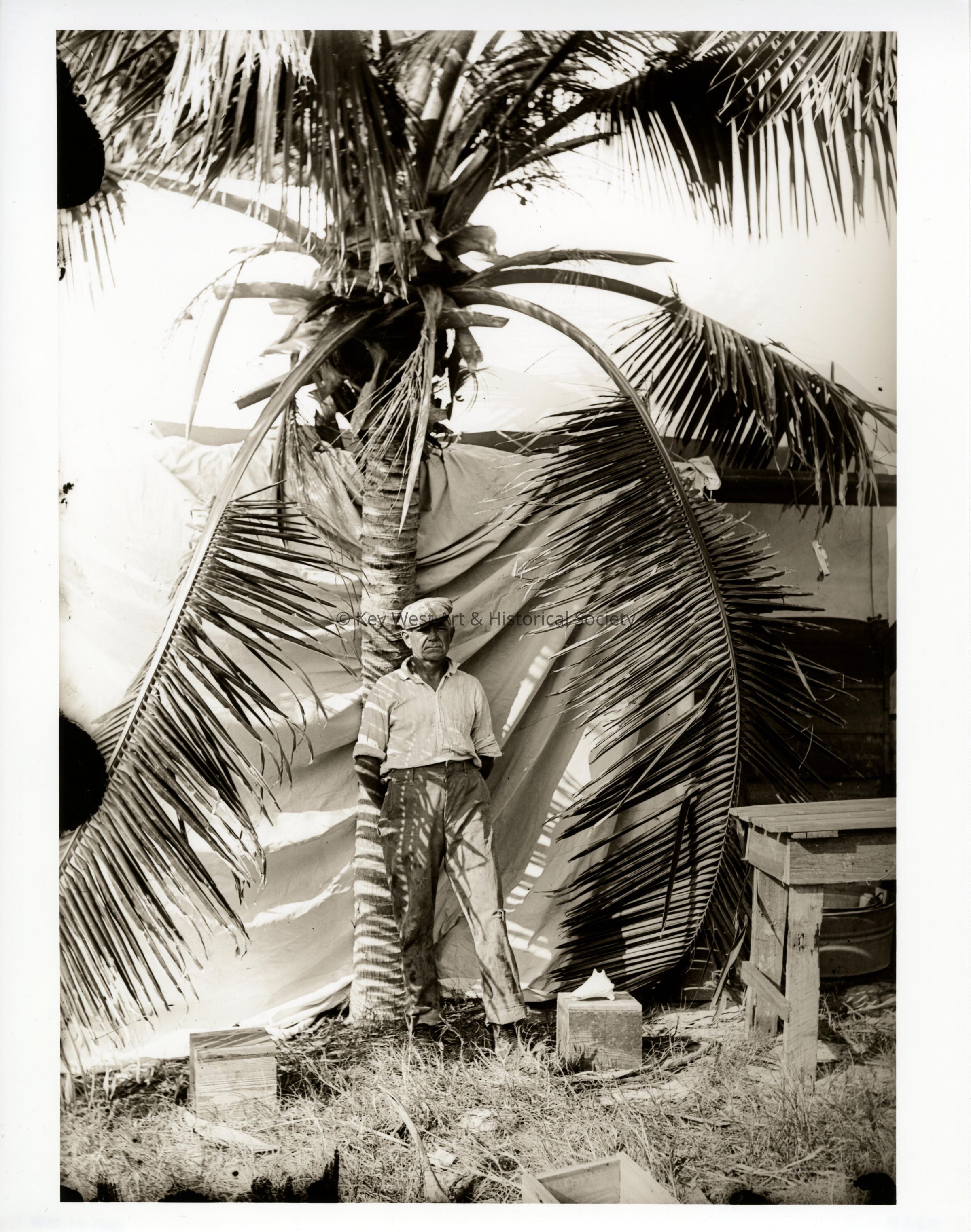 Black and white print taken from a dry plate glass negative of an unknown man standing in front of palm tree at the railroad camp on Pigeon Key. The image was taken during the construction of Seven Mile Bridge on the Overseas Railway.