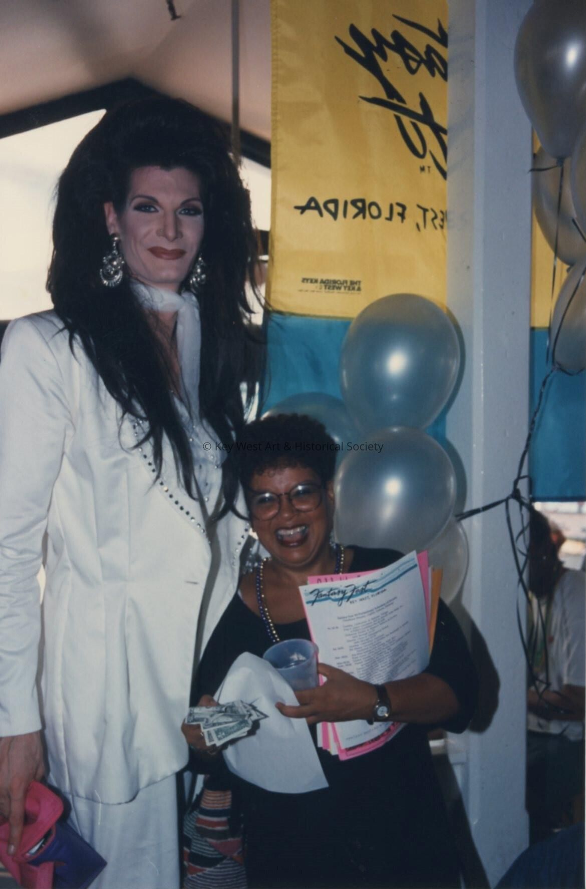 Unknown man dressed as a woman standing with a woman.Entry/Object ID
